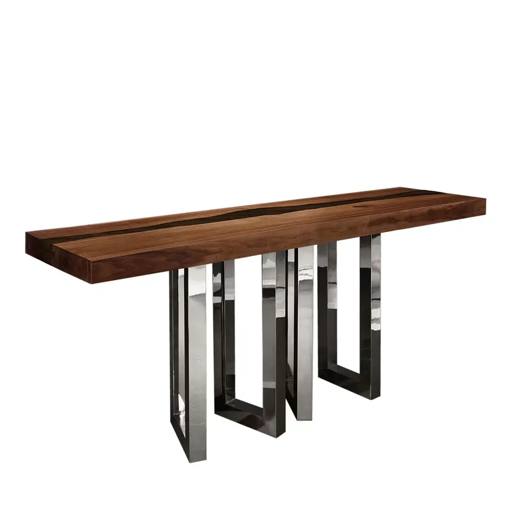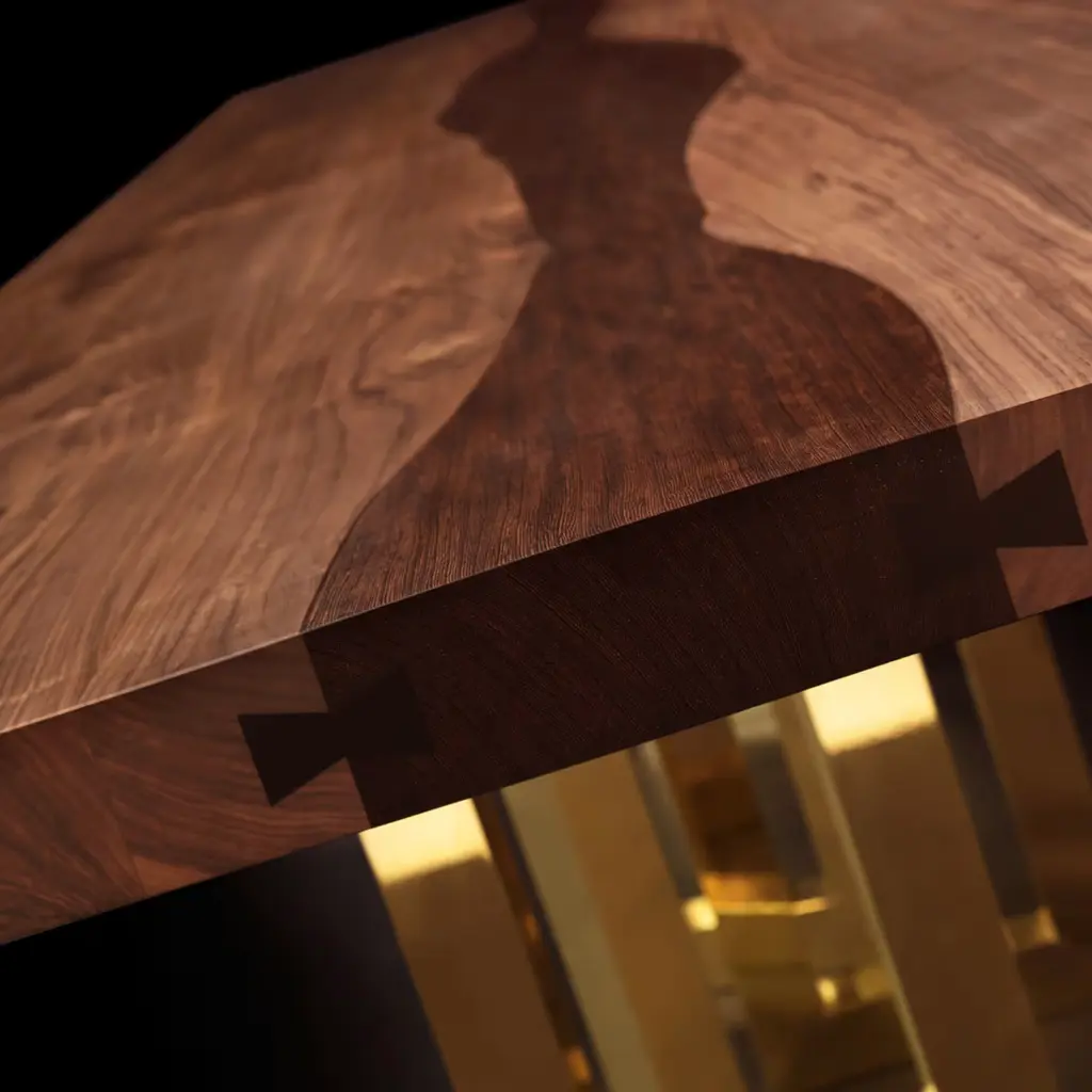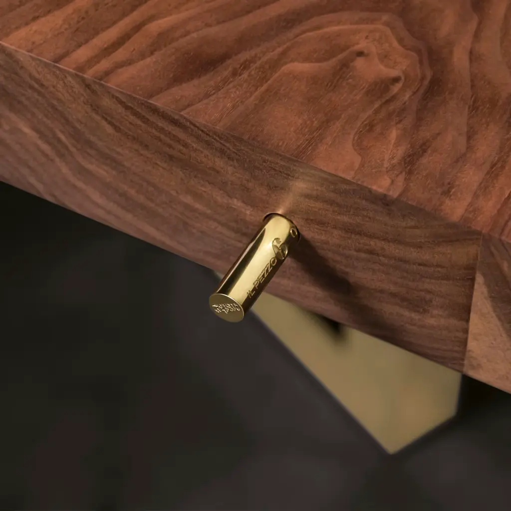 Il Pezzo 6 Table is a masterpiece of solid walnut and wengé designed by Cosimo Terzani and Barbara Bertocci. It is supported by hand-welded brass legs with a gold finish. Its walnut top showcases flowing wood grains, treated with an organic silica-based nanotechnology for a water-repellent finish. Each table includes the unique “Missing Piece” brass cylinder for authenticity. It is available in other finishes and sizes, please consult the concierge for details.