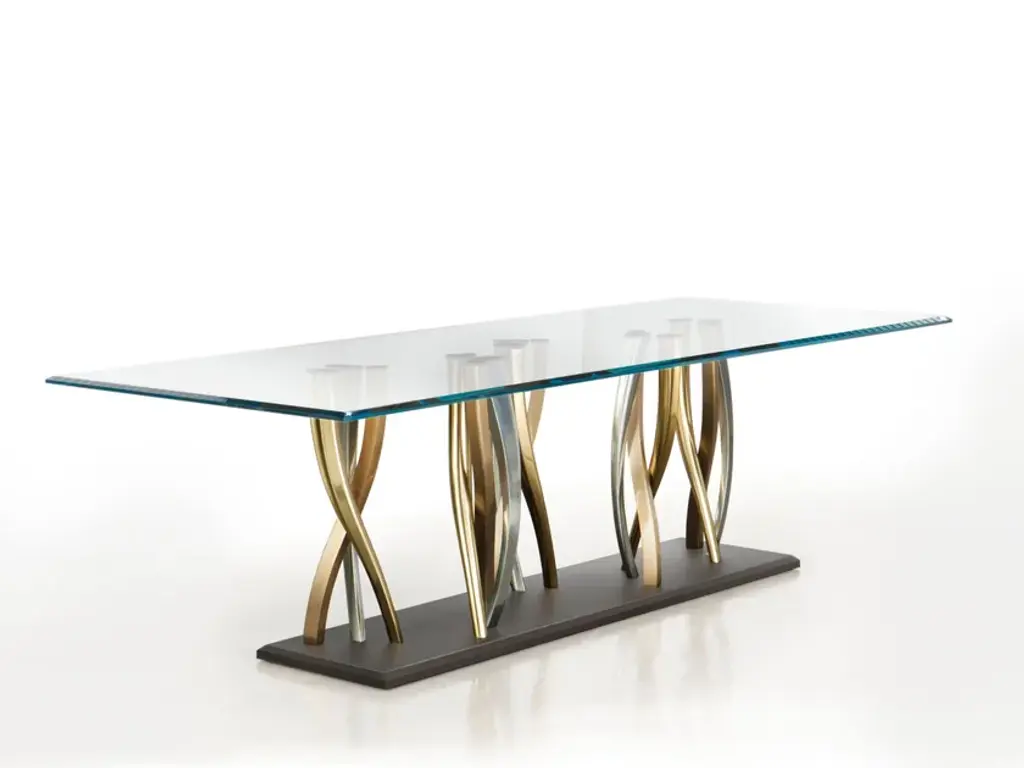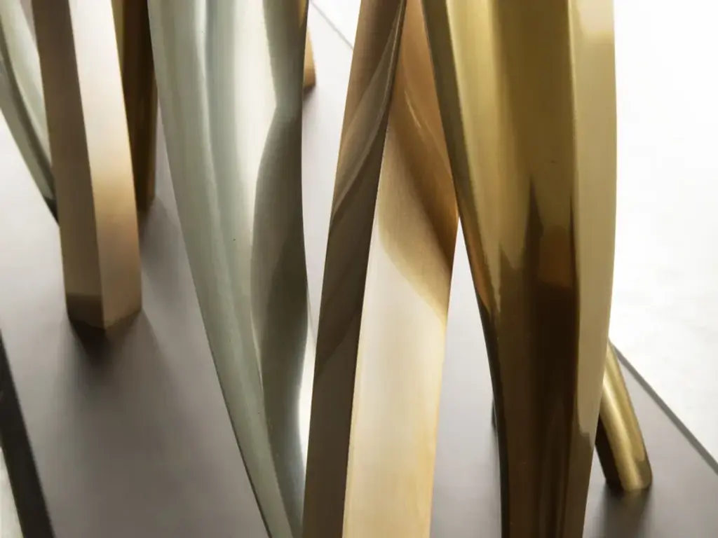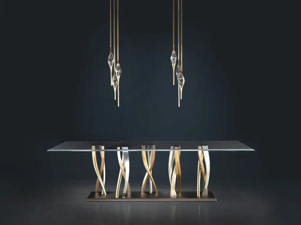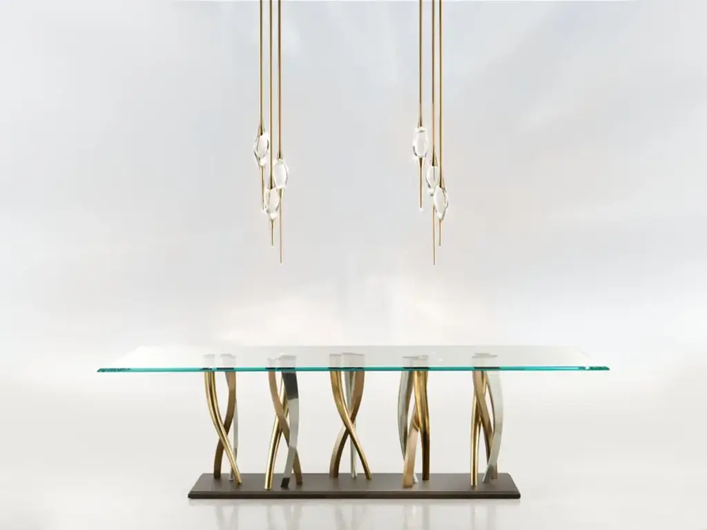 A sparkling forest of twisted legs made by casting, in nickel, champagne and bronze finishes, creates a stunning display of contrasting colors. This awe-inspiring base provides unwavering support to the extra clear glass tabletop, allowing its transparency to showcase the captivating base. The legs of Il Pezzo 8 Glass Table are crafted by master artisans in a renowned Tuscan foundry utilizing the time-honored technique of sand casting. Witnessing the transformation of liquid aluminum into intricate shapes is a truly remarkable experience. This process allows us to gain a profound appreciation for the final outcome: solid, captivating legs that possess a uniqueartisanal charm.Each table is numbered and shows the “Missing Piece” (“Pezzo Mancante” in Italian): a small brass cylinder containing a unique serial number, guarantees its authenticity and individuality.Custom sizes are also available to suit every preference.All our masterpieces are meticulously crafted in our Atelier located in Florence, Italy, from a small team of people driven by a shared passion for quality and beauty. We constantly strive to create unparalleled works of art, where each piece is a testament to our commitment to craftsmanship and innovation.