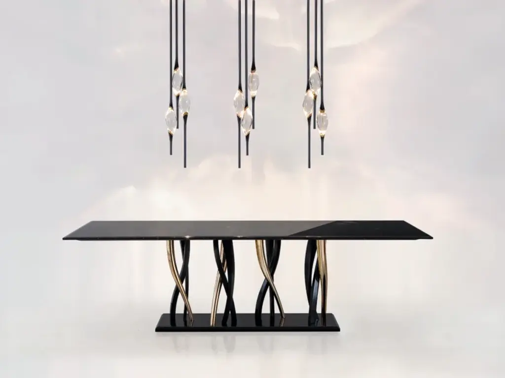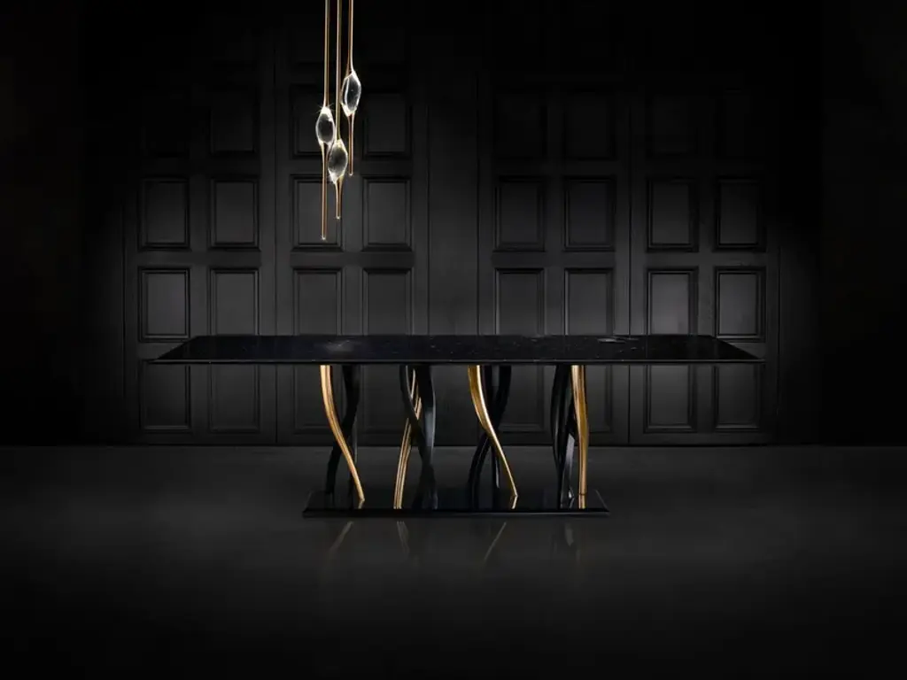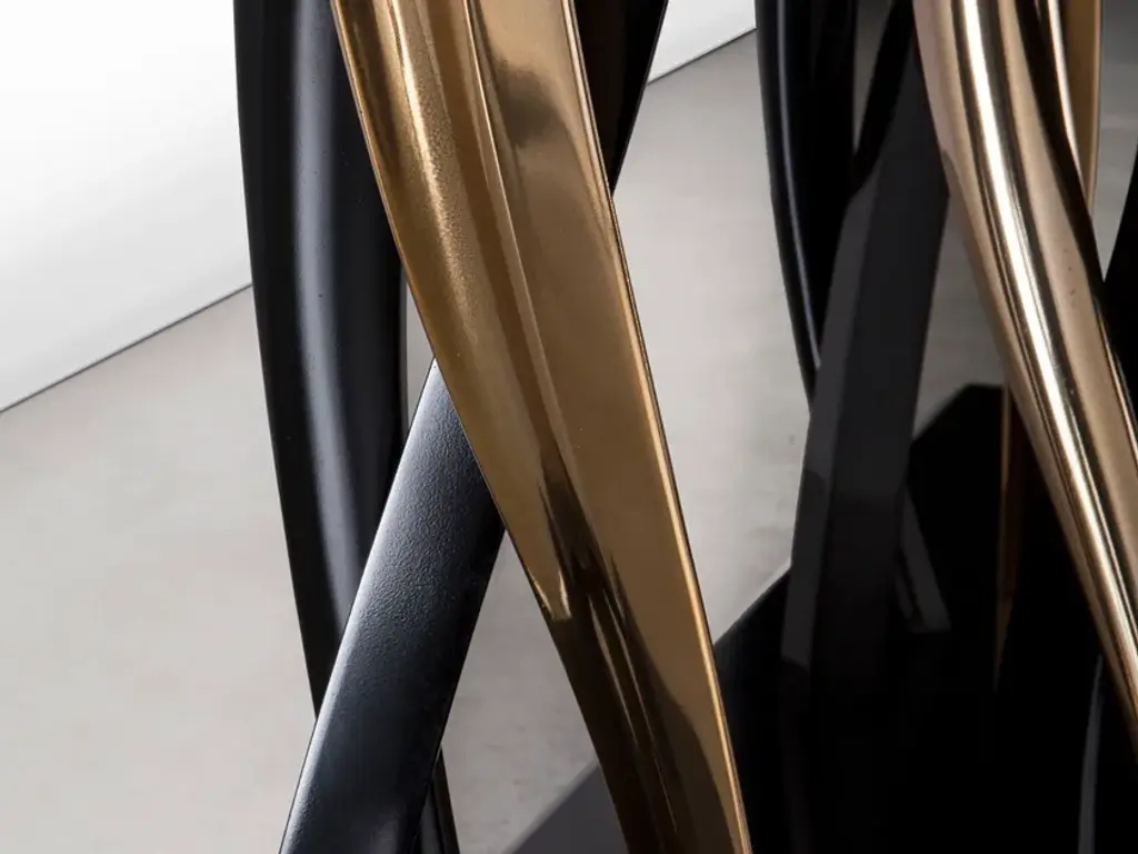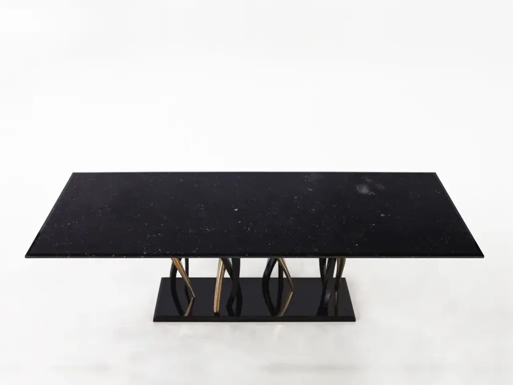 A sparkling forest of legs support a majestic block of marble. Il Pezzo 8 shows its black and gold colors as an eclectic, elegant match you can loose yourself in. The tabletop is made of a thin slab, or two mirrored slabs, of polished Marquinia marble; the legs are made of casting, in black and gold finishes. A small brass cylinder inserted in every piece, containing serial number, seals the authenticity and uniqueness. Available in custom sizes and finishes.