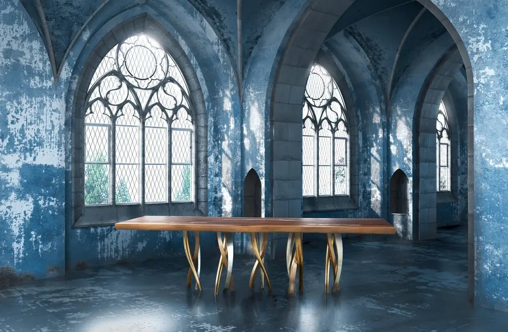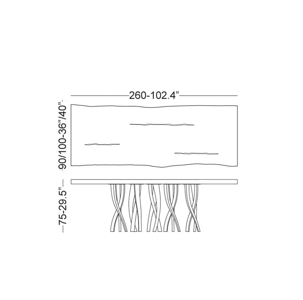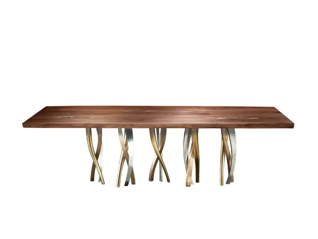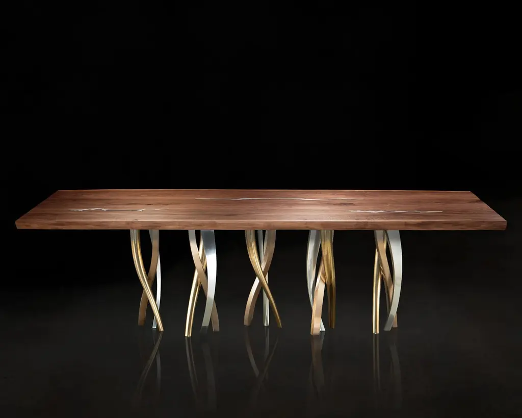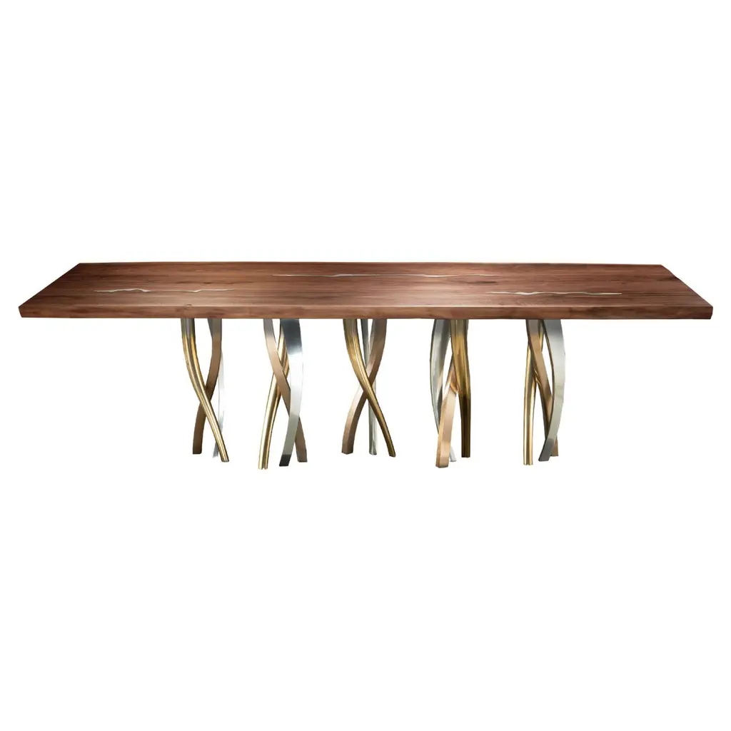 A sparkling forest of legs supports a majestic block of wood with strong, lively outlines. Il Pezzo 8 Table is a collection of colour, shape and materials you can loose yourself in. It is romantic, sinuous and light and at the same time solid, rich and imposing. The tabletop, with its organic shape, is crafted from 7 cm of thick solid walnut with beautiful nickel-plated brass inlays that add a touch of radiance to the surface. The choice of the wood grain alignment is done with great care to create flowing veins and colours throughout the top. The top is smoothed and left as natural in order to appreciate the beauty and flow of the wood. The final treatment is done with natural oil that protects the wood but at the same time lets it breathe and leaves the extraordinary feel of this beautiful natural material unchanged to the touch. Furthermore the final coat on the top is done with Nanotechnology, an organic silica-based natural treatment which makes the wood water repellent. The legs are made of sand casting, following the noblest Tuscan artisan tradition. Their shape and sheen contrast with the heaviness of the material and its special crafting process showcasing the wisdom of the master foundry workers. Each table shows the “Missing Piece” (“Pezzo Mancante” in Italian): a small brass cylinder containing a unique serial number, guarantees its authenticity and individuality. Custom sizes and finishes are also available to suit every preference.All our masterpieces are meticulously crafted in our Atelier located in Florence, Italy, from a small team of people driven by a shared passion for quality and beauty. We constantly strive to create unparalleled works of art, where each piece is a testament to our commitment tocraftsmanship and innovation.Top: live edge solid walnut with nickel inlaysBase: bronze, satin brass, nickel finishesSize: 300x100/110xH75 cm - 118"x40"/44"xH29.5"