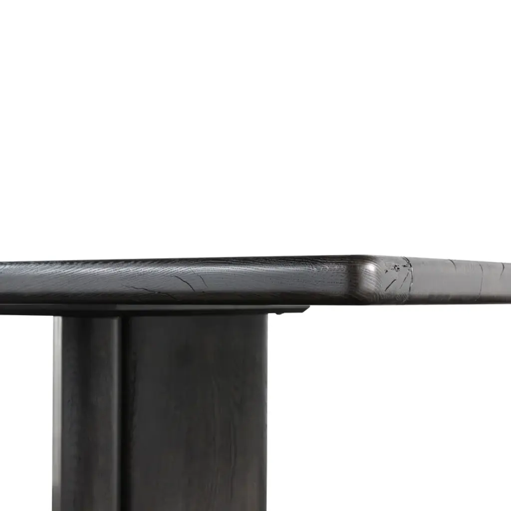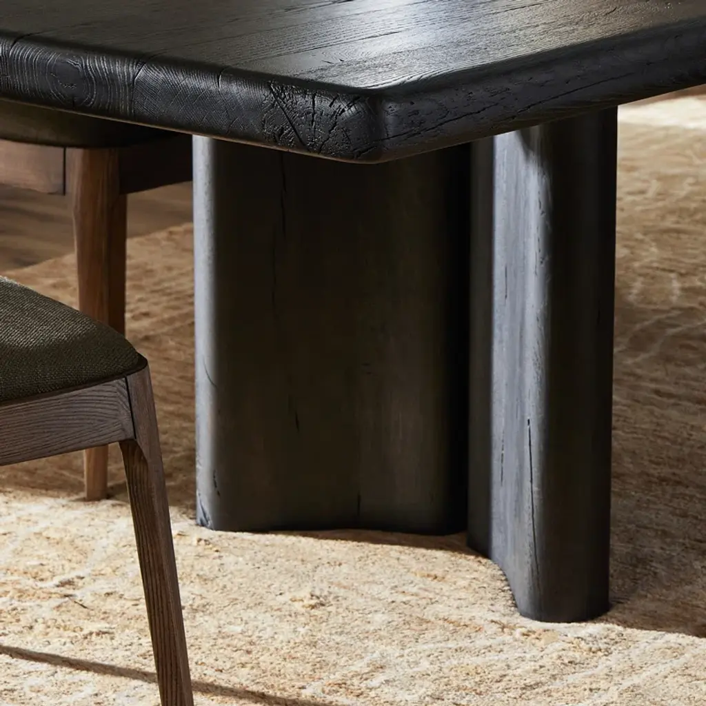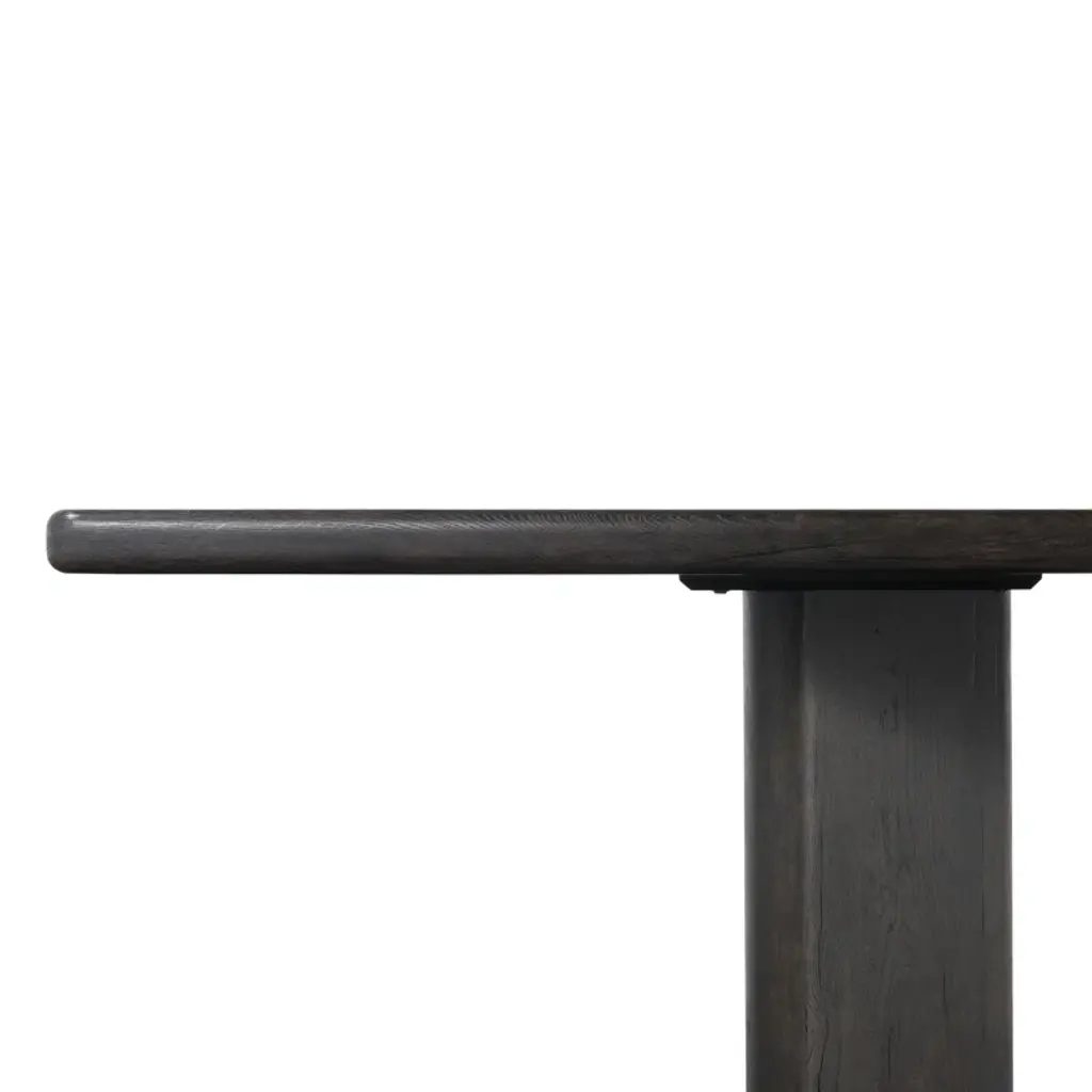 Designed in partnership with longtime collaborator Thomas Bina and Brazilian designer Ronald Sasson, a grand-scale dining table is made from solid reclaimed French oak finished in a deep espresso. Rounded edges add a softer, fluid look.