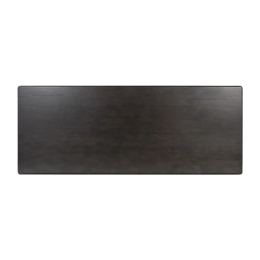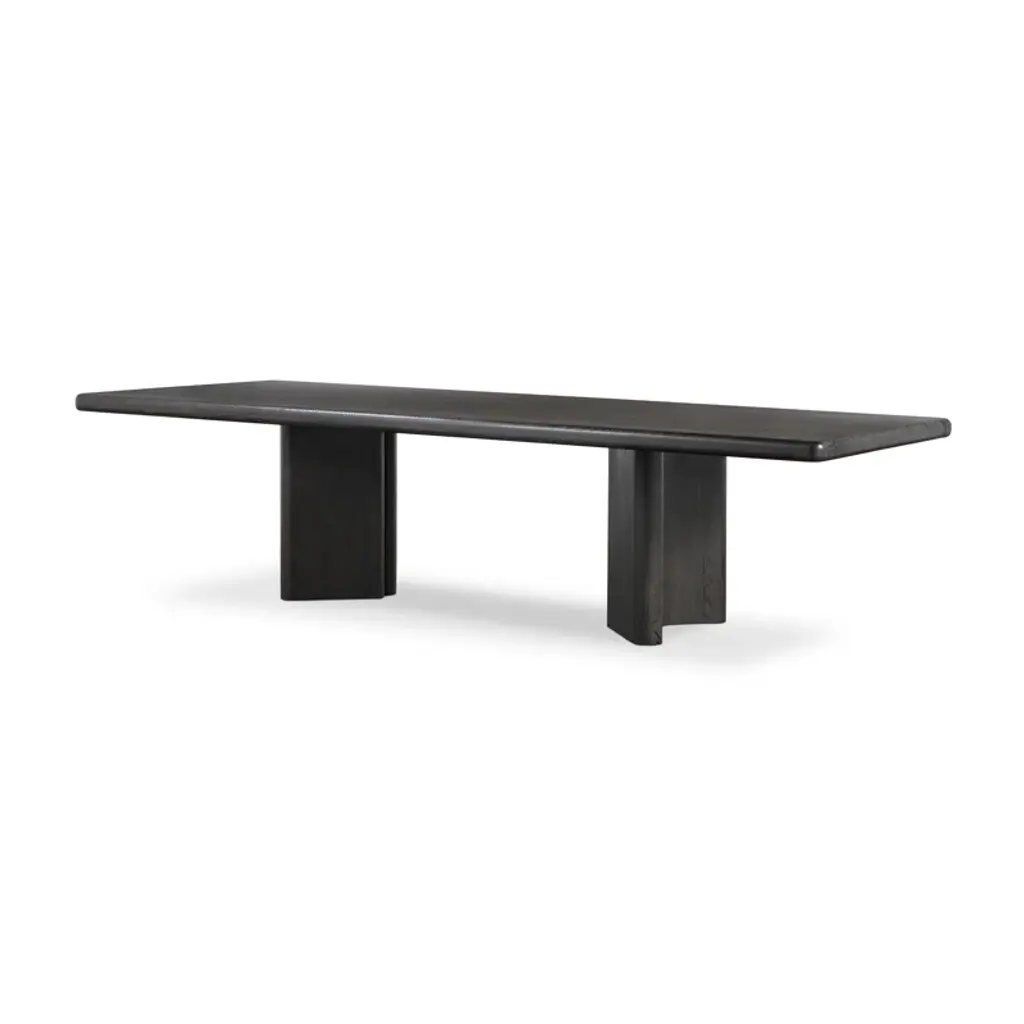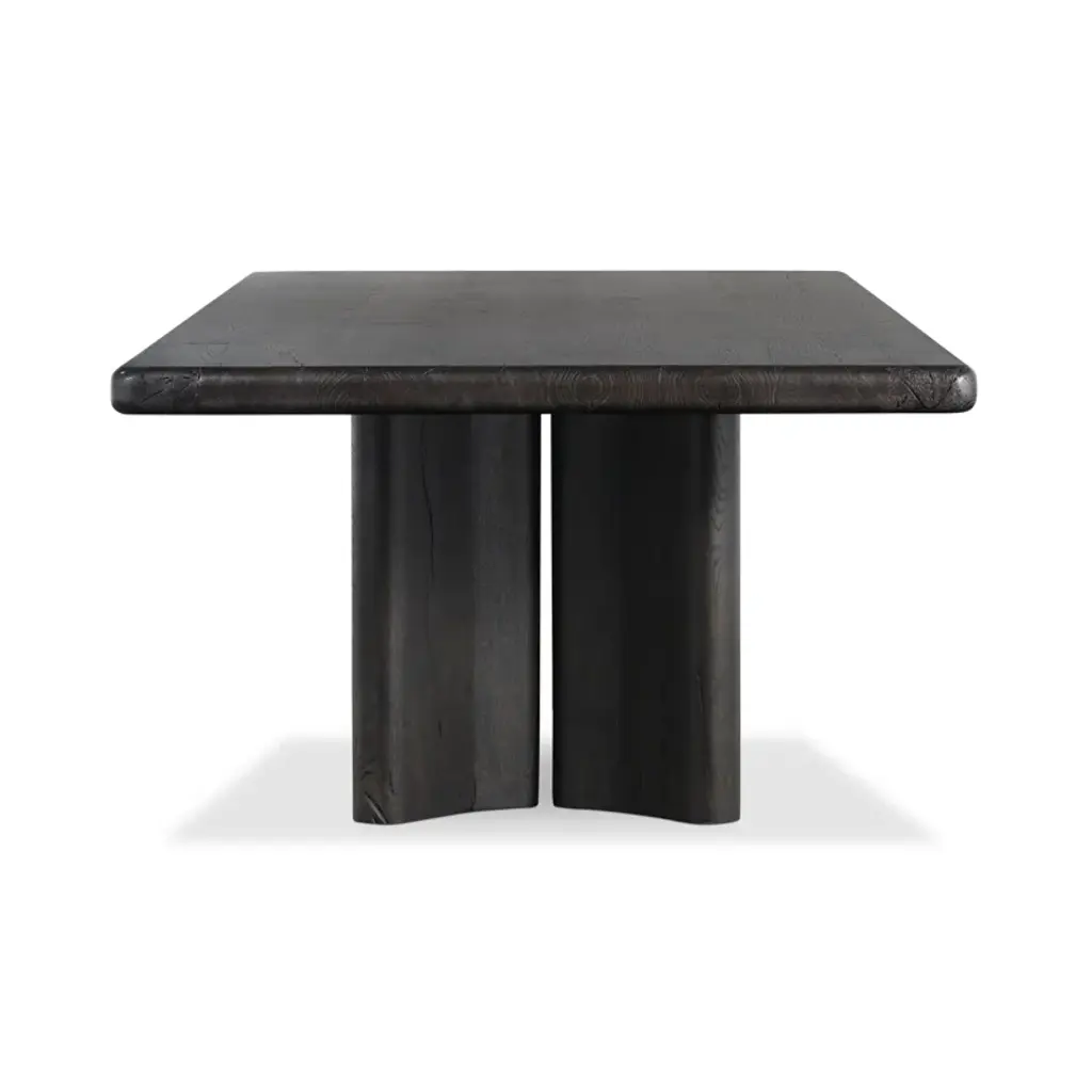 Designed in partnership with longtime collaborator Thomas Bina and Brazilian designer Ronald Sasson, a grand-scale dining table is made from solid reclaimed French oak finished in a deep espresso. Rounded edges add a softer, fluid look.