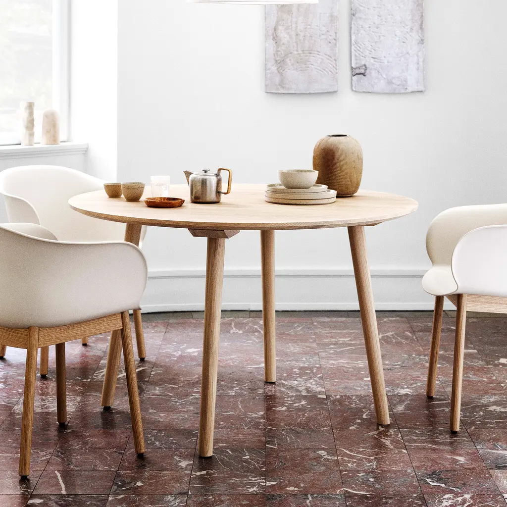 Indulge in sophistication with the In Between Round Dining Table from &tradition. Crafted by Sami Kallio, this Scandinavian-inspired piece combines traditional woodworking techniques with modern design for lasting appeal. Available in three variants, pair with the matching chairs and bar stools for a complete, unique dining experience. Highlights