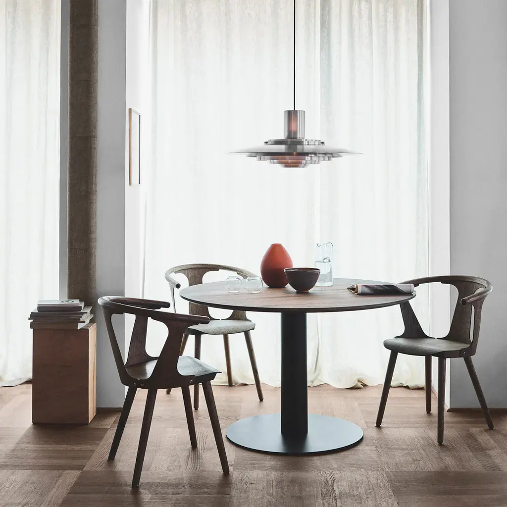 The In Between table with a center base introduces even more space for people to gather together. Inspired by Sami Kallio's exploration into positive and negative space, it converges traditional wood turning craftsmanship with modern compression molding and special veneer techniques. Look for the table top in veneer, plywood, linoleum or Fenix. Add a black powder-coated circular base and together you have a modern expression that can easily be integrated into virtually any venue for people to enjoy a meal or simply each other's company. Larger version (SK12) available here
