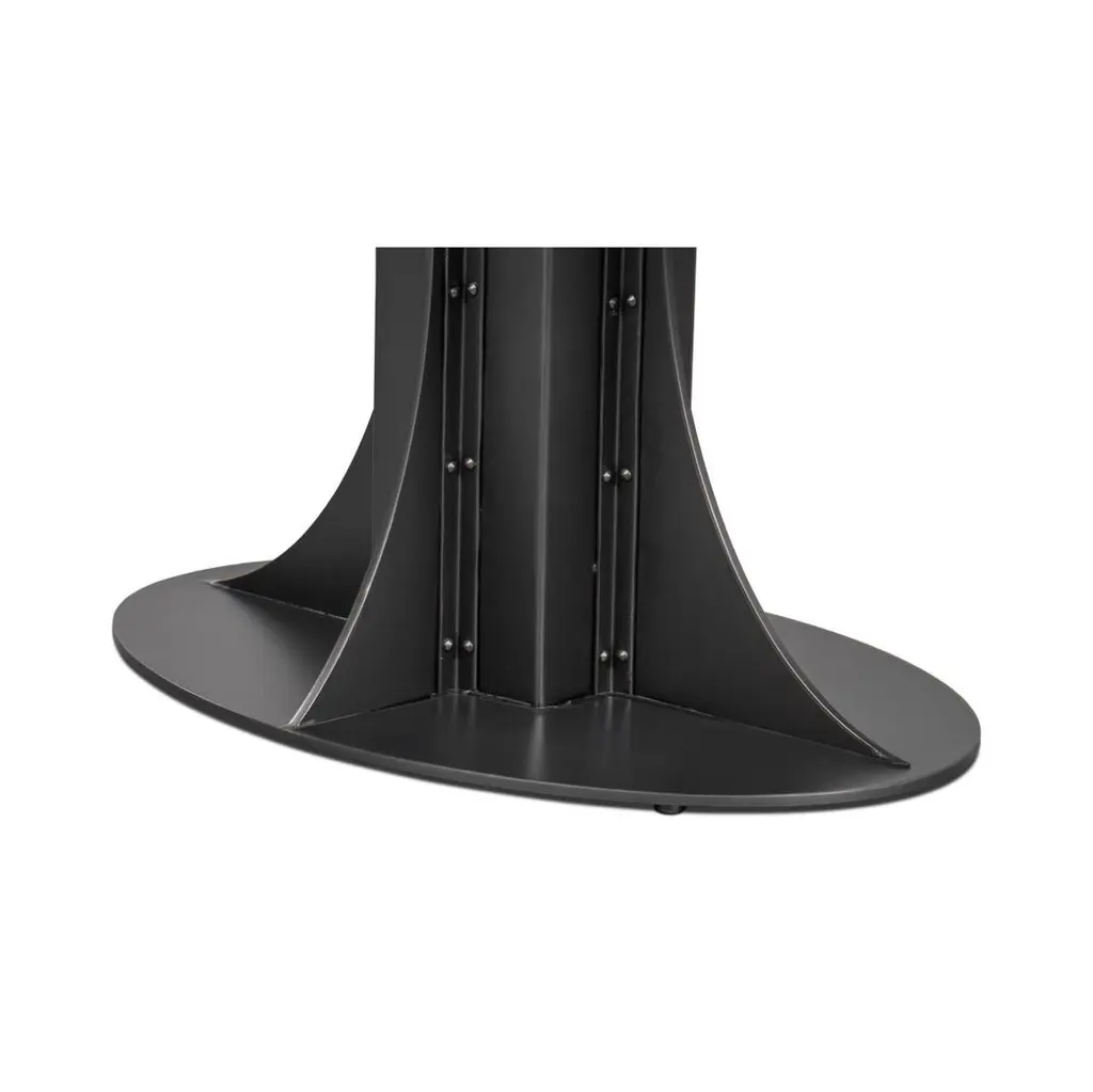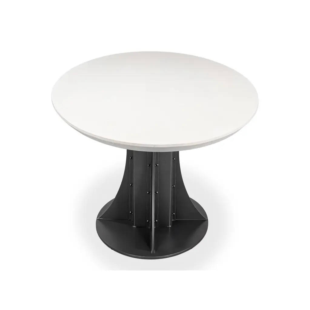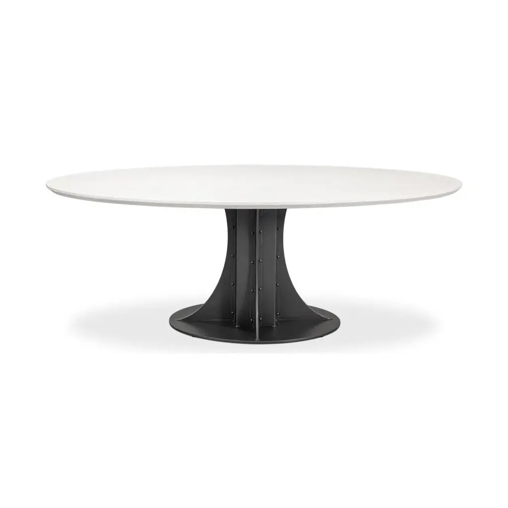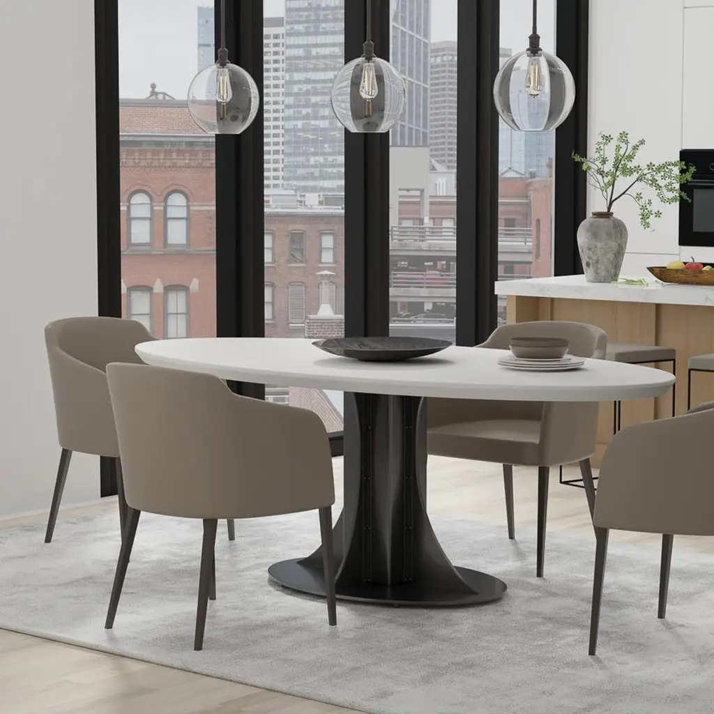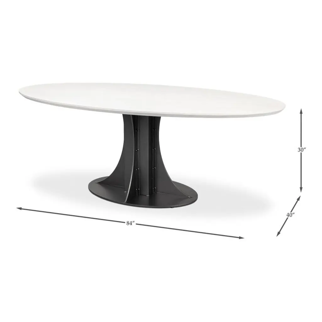 A perfect blend of contemporary style and industrial flair. The table features an elegant oval top crafted from wood, finished in a white painted finish that offers a clean, modern look.The base, made of iron with a sleek gunmetal finish, adds a touch of industrial edge. This combination of materials and finishes creates a piece that fits seamlessly into any modern dining space.Dimensions: 84" W x 40" D x 30" H