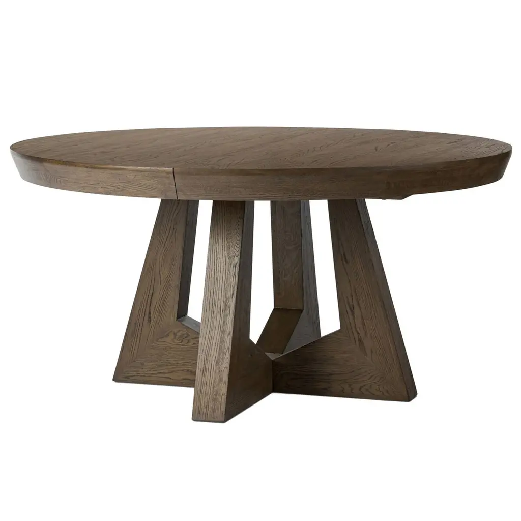 This stylish table features a neutral oatmeal finish and a round top adorned with an intricate radial pattern, offering a unique and elegant focal point. The table is supported by six robust legs, providing both stability and a striking visual element. Metal ferrules and stretcher add a contemporary industrial touch, seamlessly blending modern design with a rustic edge. Ideal for both casual meals and sophisticated gatherings, this table is a perfect addition to any modern home. Dimensions: 72" W x 72" D x 30" H