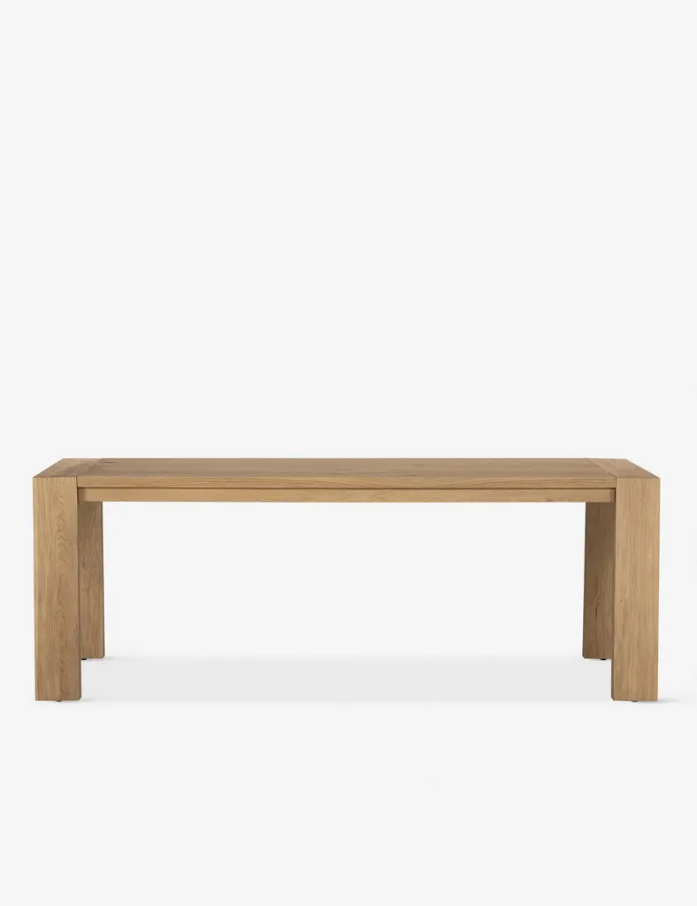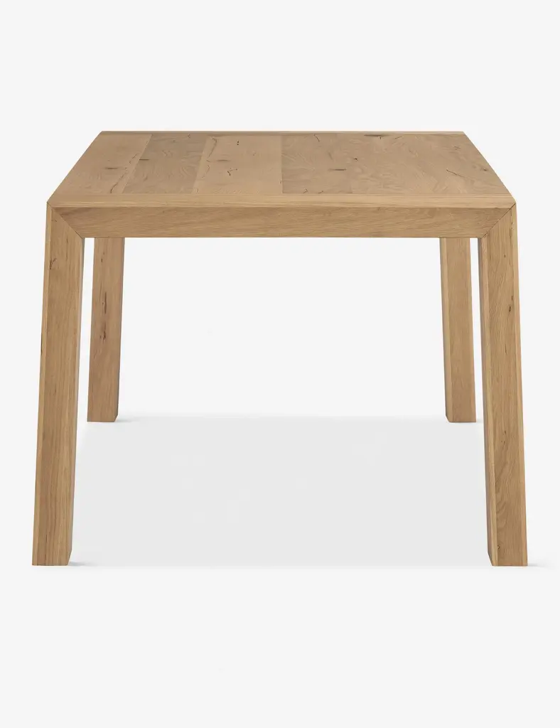 A classic rectangular dining table, reimagined with stunning details that highlight the organic appeal of the oak woodgrain. This wood kitchen table features a paneled top, with sturdy legs that splay out at a subtle angle.