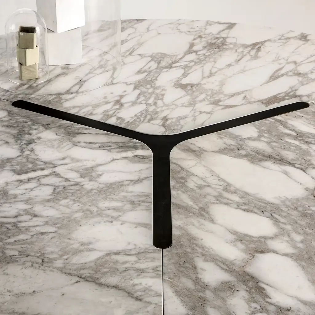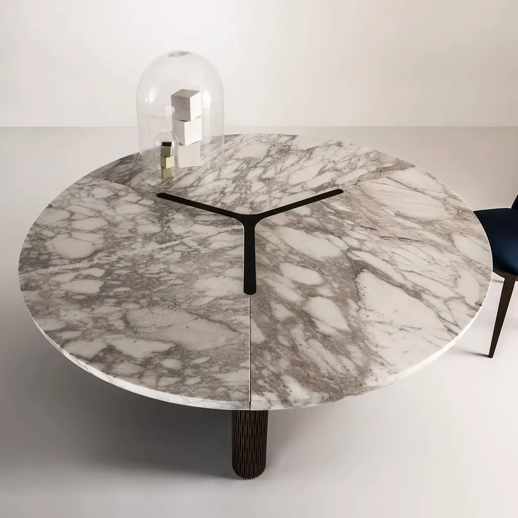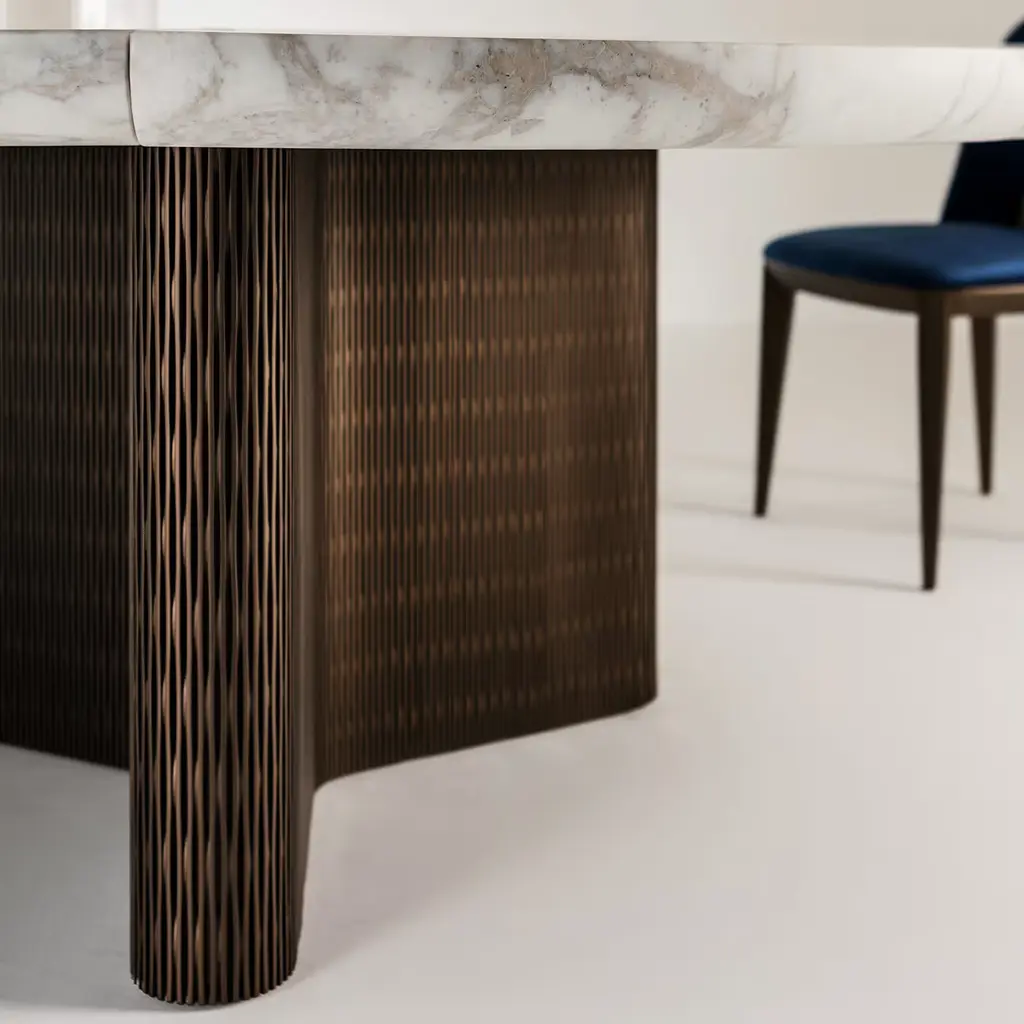 This beautiful round dining table comes in a matte polished marble top with burnished brass inserts in the middle. The table top rests on a solid structure in wood finished in bronze that has a rippled structure for an eye-catching effect. This unique piece will be a lovely addition to any home or office space.