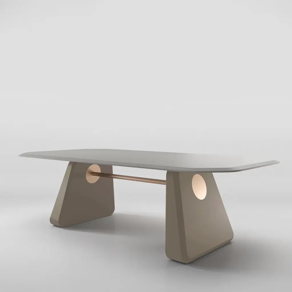 The Inge table features a striking top, supported by two large plinths. A beautifully detailed bar spans the distance between them and holds the two together. Inge, designed by Artefatto Design Studio, takes its name from a famous rock formation in England but is heavily inspired by Japanese architecture. Here in Wood Lacquered Glossy Moor Oak and Satin Bras metal finish. It is also available in a variety of different options.