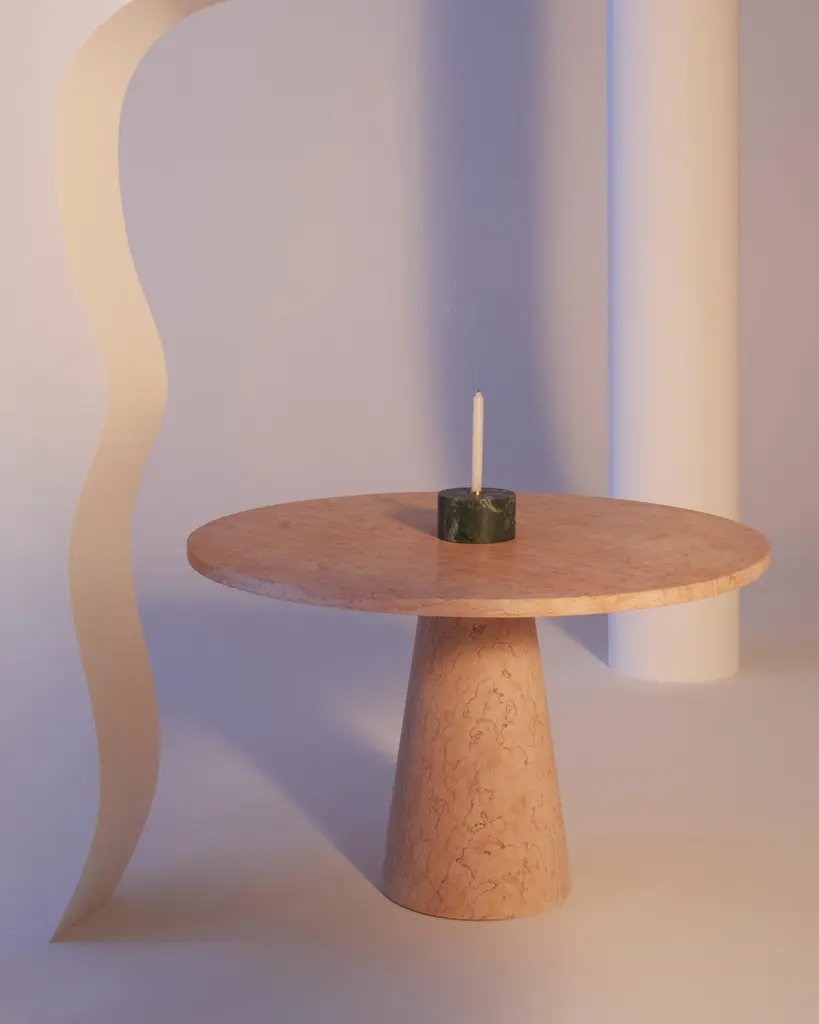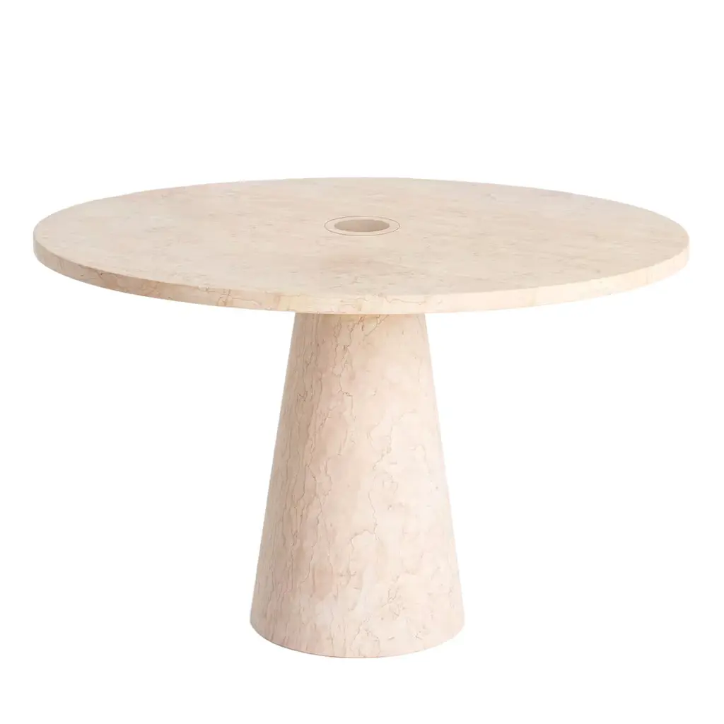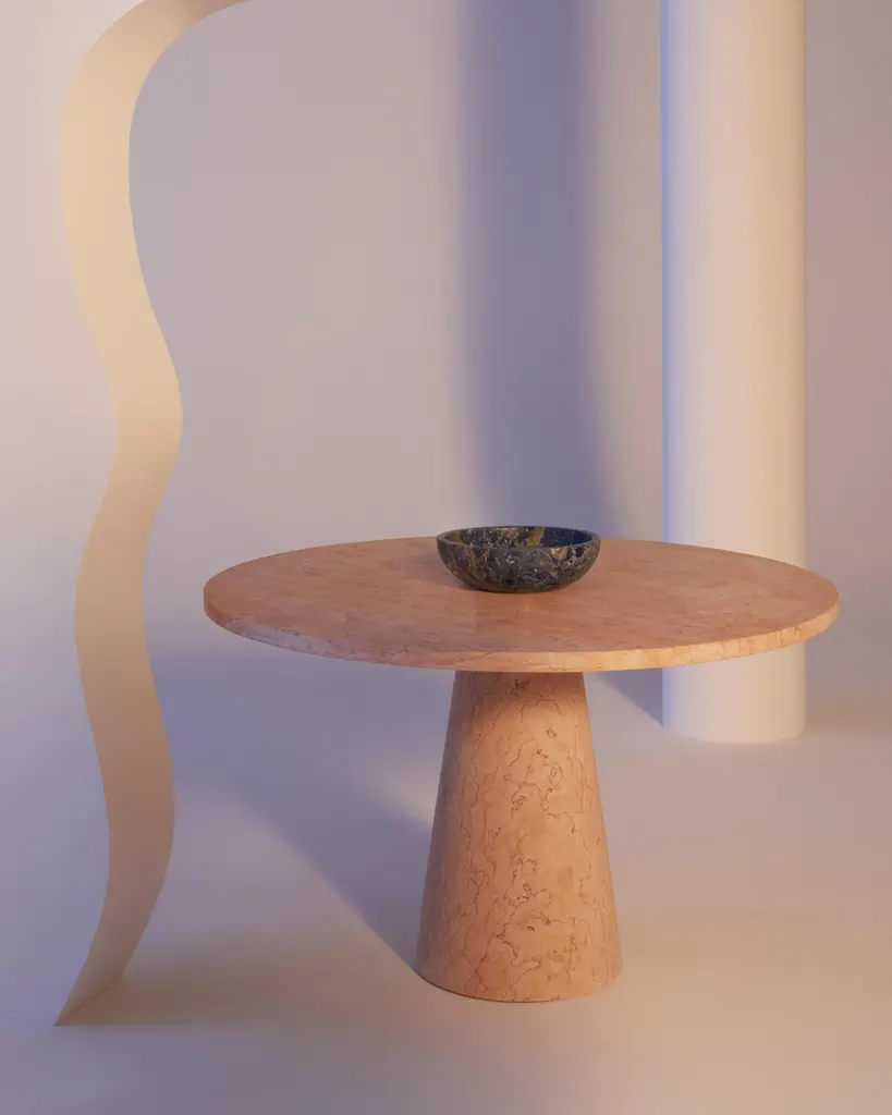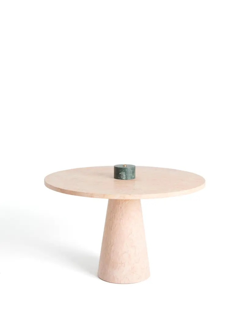 Inside out dining table by Karen ChekerdjianDimensions: Ø top 120 x Ø base 40 x 74Materials: Rosa EgizianoKaren’s trajectory into designing was unsystematic, comprised of a combination of practical experience in various creative fields and endeavours.After an experience at Leo Burnett Beirut (1991), she moved to Milan in 1997 to pursue a master’s degree in industrial design at DOMUS academy, under the guidance of Massimo Morozzi,a founder of Archizoom. She continued to work with Morozzi at EDRA for four years before establishing her own brand.Her creations have been showed in several museums, foundations, galleries and international fairs. Her famous “Totem” is part of the permanent collection of the Musée des Arts Décoratifs in Paris.