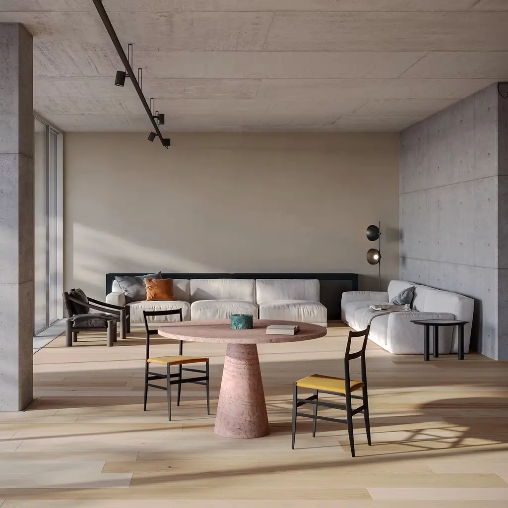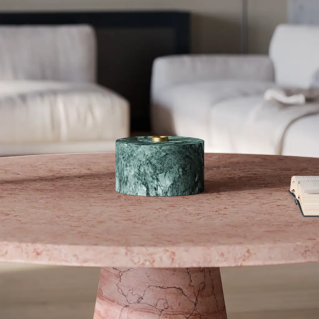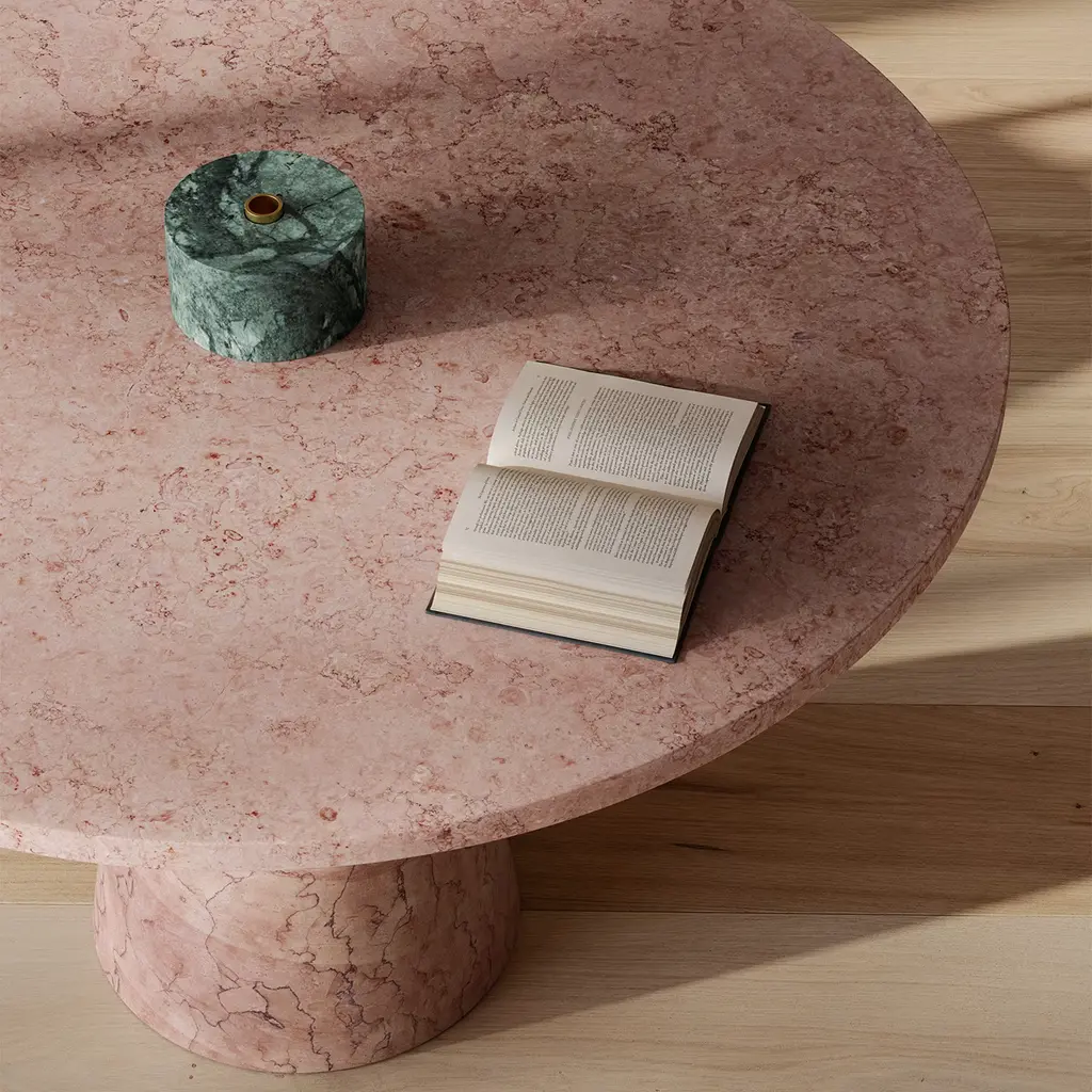 Pure geometric volumes and the feminine flair of pink Egyptian marble merge in this stunning dining table, ideal to bring a touch of femininity to any contemporary dining room. The pastel shade of pink is naturally enhanced by the delicate yet consistent veining typical of the marble, resulting in a harmonious, one-off silhouette. Part of the Inside Out Collection, this exclusive round table can be combined with accessories as vases from the same series for a cohesive and complete look. Please note that marbles and stones are natural materials and they can differ also if coming from the same quarry or the same block. The product shown may differ from purchased items. Every piece is unique. Please read carefully the unpacking and handling instructions. Also available without the hole, price upon request.