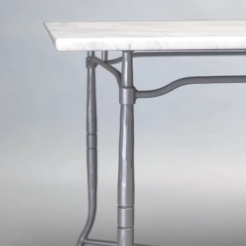 Part of the Intreccio Collection of outdoor furniture, this dining table sports a modern design that will blend perfectly with any existing decor. Practical and elegant, the white Carrara marble top, prized for its natural grey-white veining, is perfectly matched by its forged stainless steel base featuring slender and sinuous legs embellished with round ferrules and cross bracing. This versatile dining table will be a stunning addition to any decor, particularly when paired with the chairs from the same collection. The galvanized, powdered finish ensures optimal weather-resistant performance.