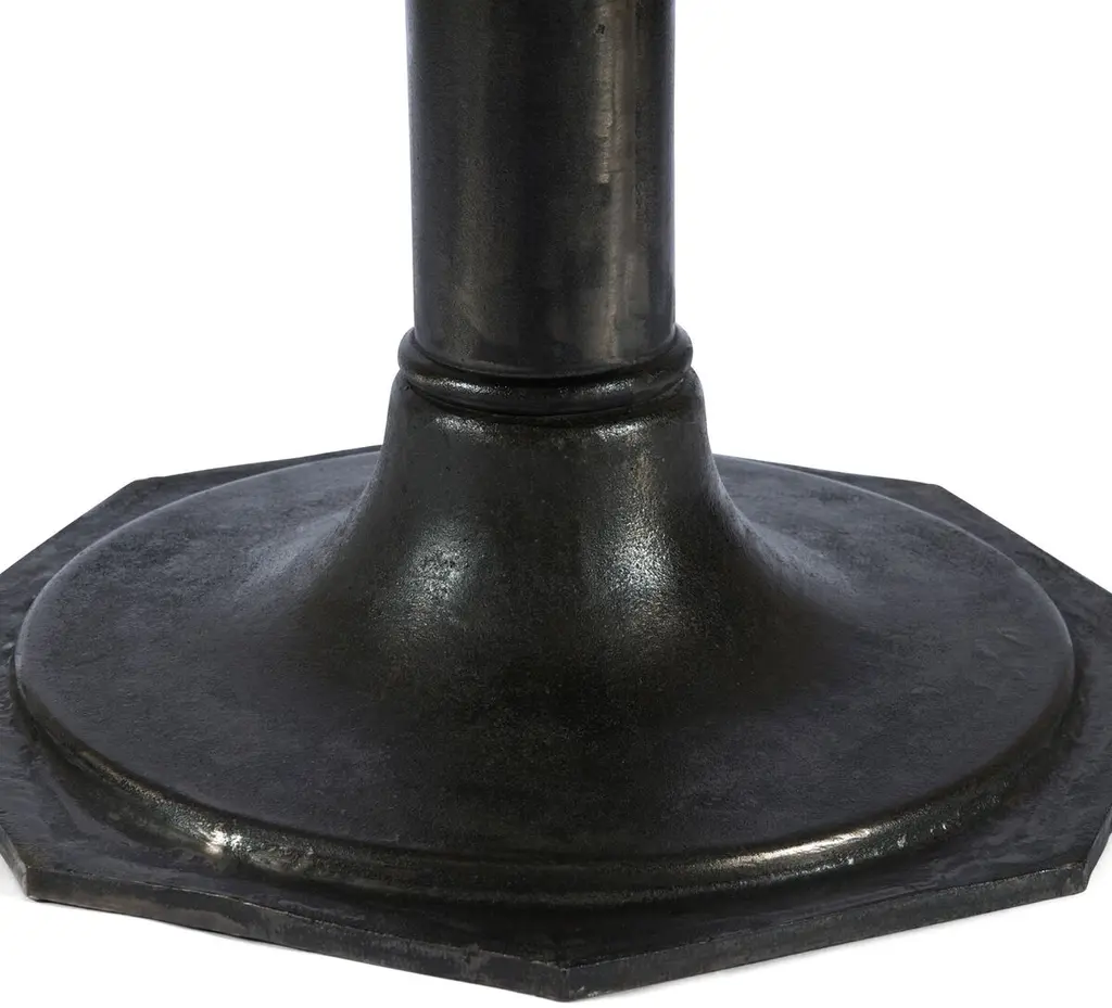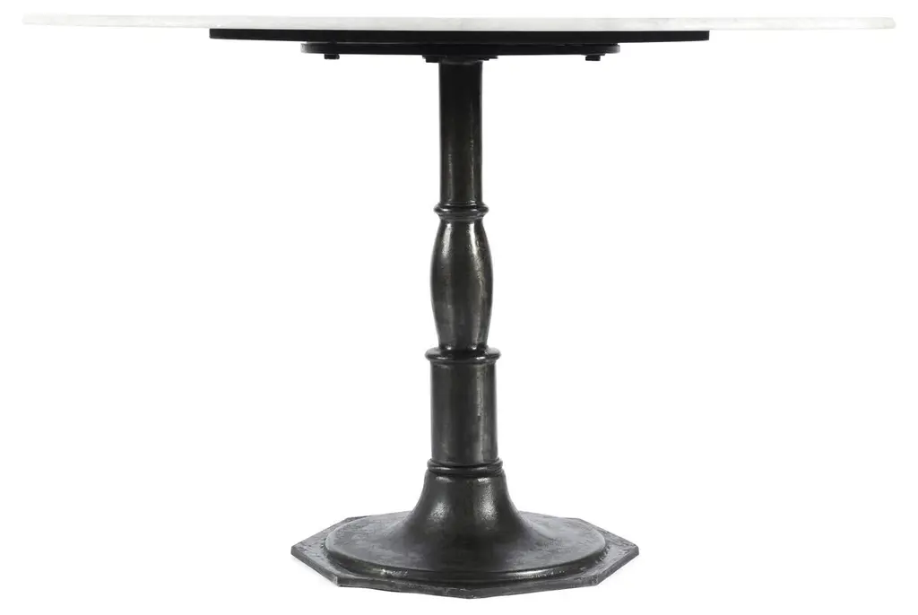 At home in a variety of decors, this dining table features a white marble top supported by an ebonized iron pedestal base.
