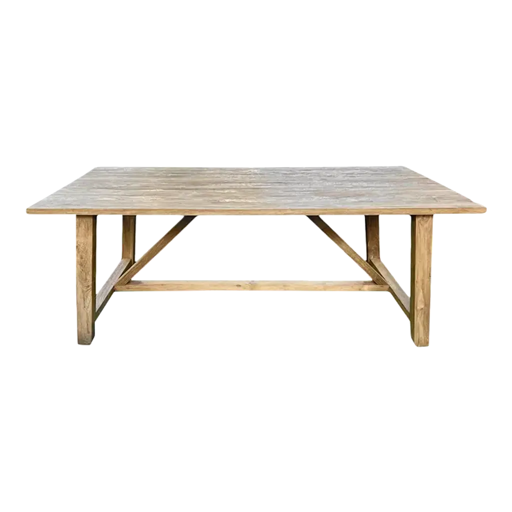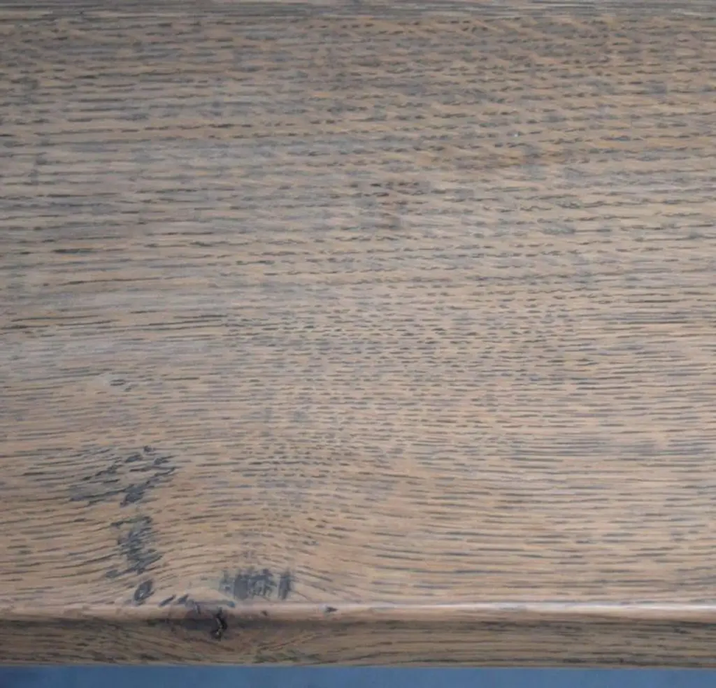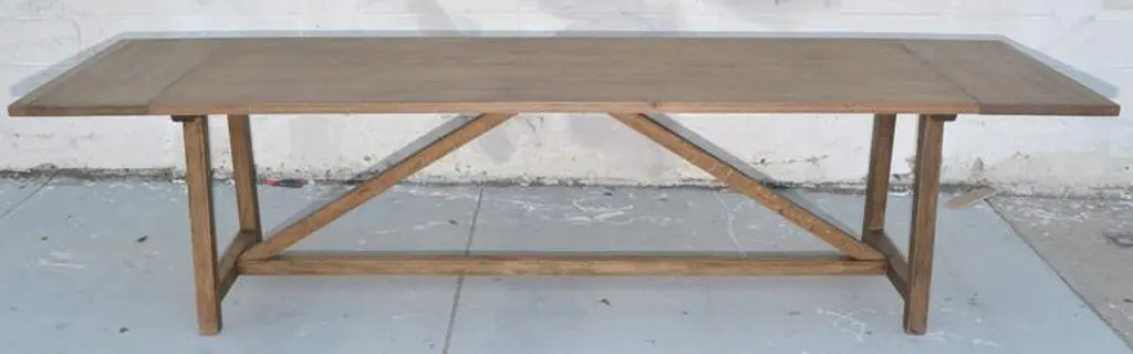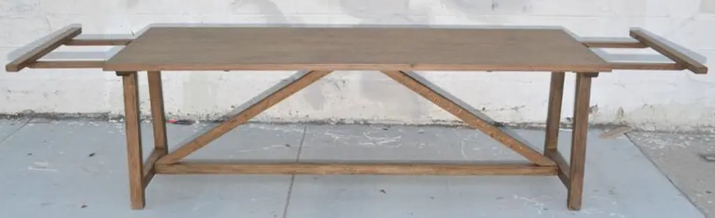 Custom dining table in distressed, rift-sawn, white oak. As shown here: 80" x 38" x 30" size. This table expands by pulling out the breadboard ends and locking in two 15" extensions for an extended length of 110" long.Because each table is bench-made in our own Los Angeles workshop you can influence all aspects of design, including size, wood species and finish. We use only traditional carpentry techniques, no nails or metal fasteners of any kind. Just mortise and tenon construction reinforced with hand-cut wooden dowels.If you require customized overhang dimensions please stipulate with order.