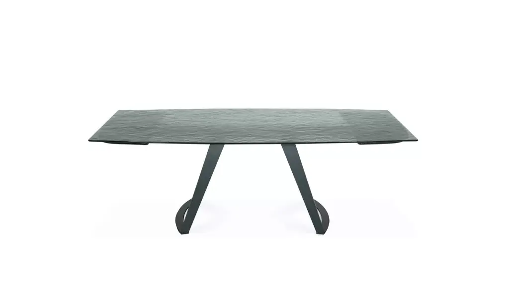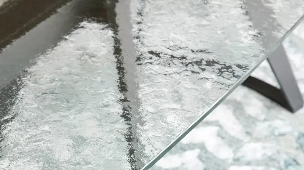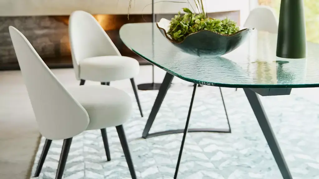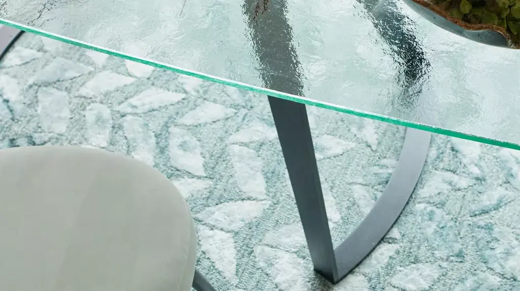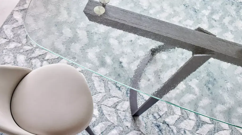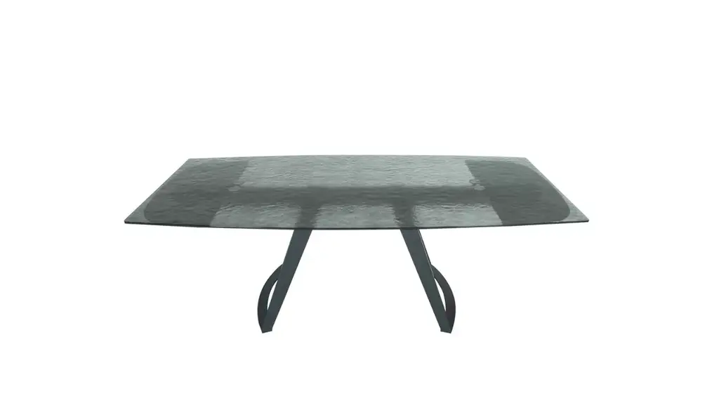 The round base gives center stage to the impressive annealed glass top: with its textured bottom and shimmering surface in a clear, in either Bronze or Bleu color, it feels like dining on a piece of water.