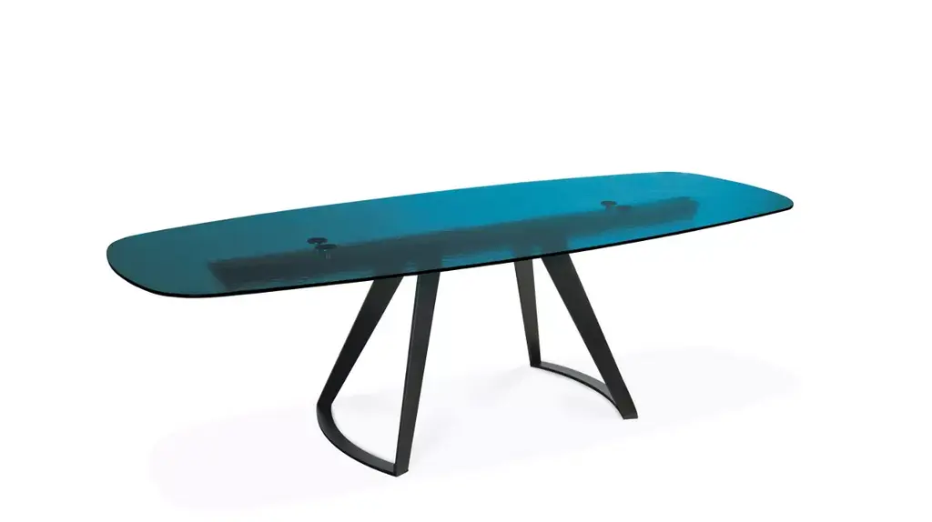 The round base gives center stage to the impressive annealed glass top: with its textured bottom and shimmering surface in a clear, in either Bronze or Bleu color, it feels like dining on a piece of water.
