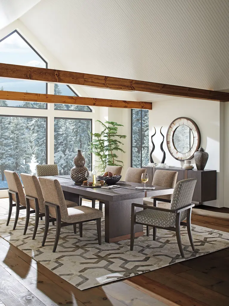 The rectangular dining table has a decorative metal insert that runs the length of the table, as well as on the two 20-inch leaves which extend the table to 128-inches. The two wooden leg panels supporting the table have a decorative metal base in a burnished bronze finish.