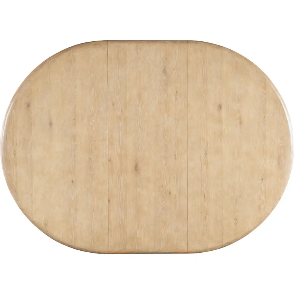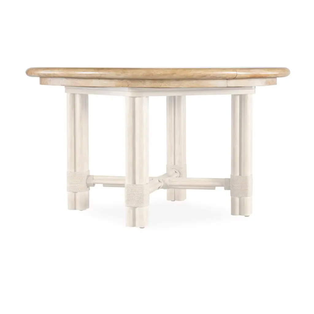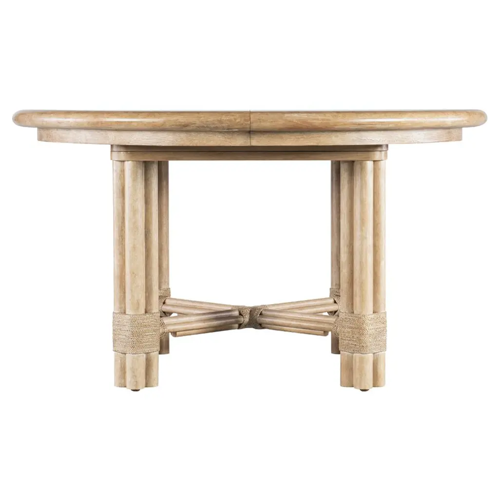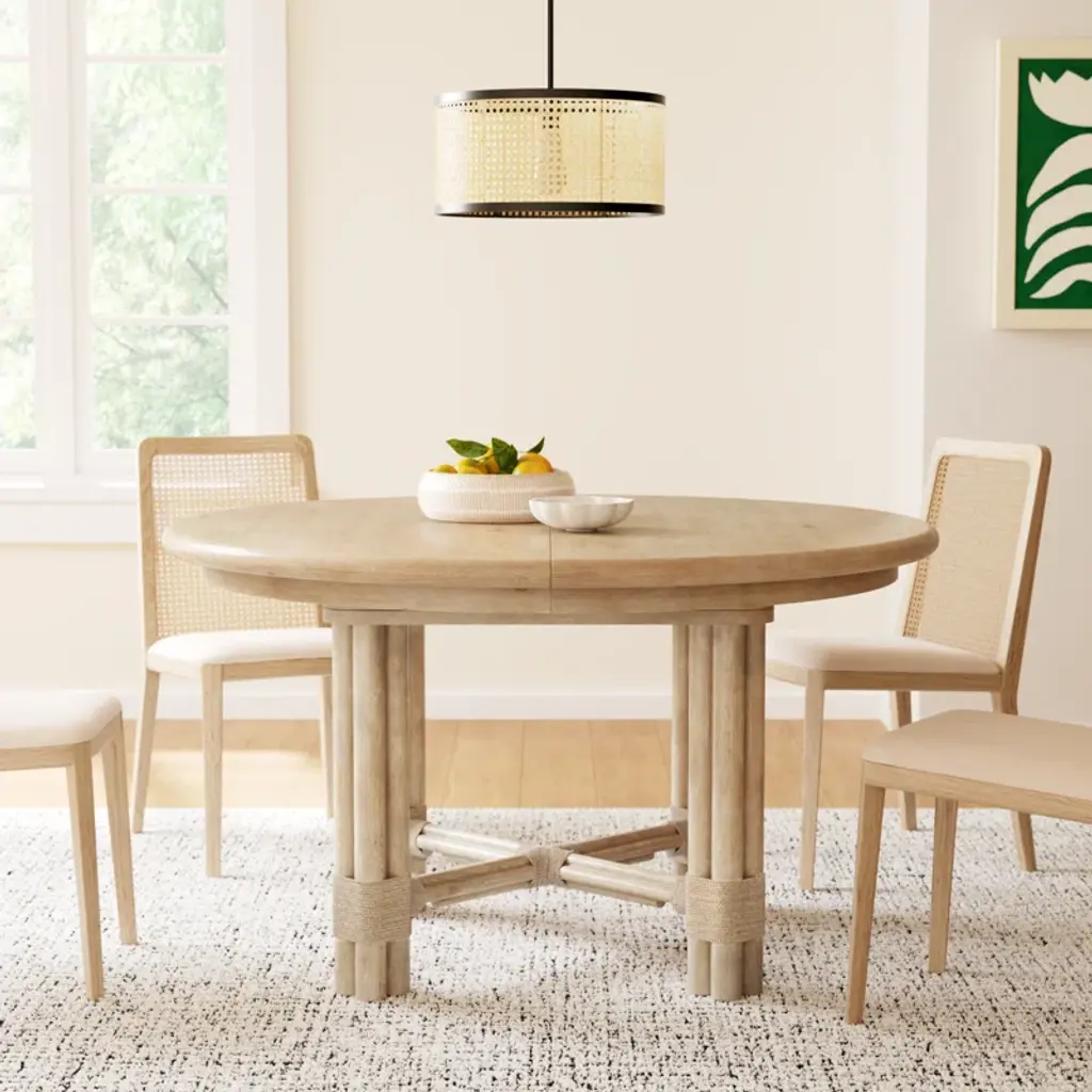 With a tropical retreat-inspired vibe accented by organic details, the Isla pole rattan round dining table has a bundled-pole-designed motif with rope accents. Crafted of oak veneers, it features a black sand finish, transparent by design to reveal the unique grain patterns of the veneer. The tabletop has a solid wood edge. When the 20-inch leaf is in place, the table extends to 74 inches and accommodates up to 8 coordinating chairs. Without the leaf, it accommodates up to 6 coordinating chairs.