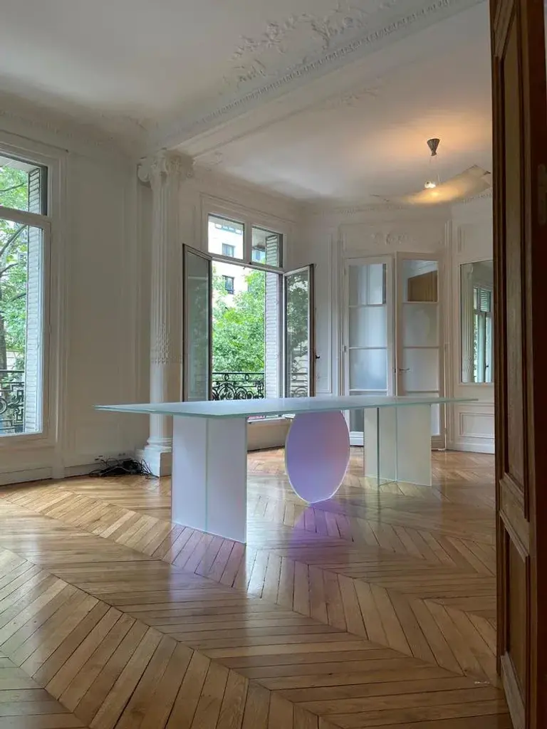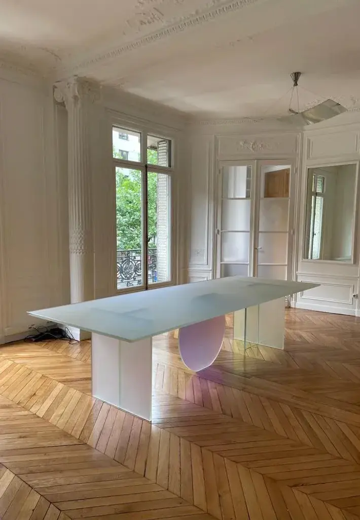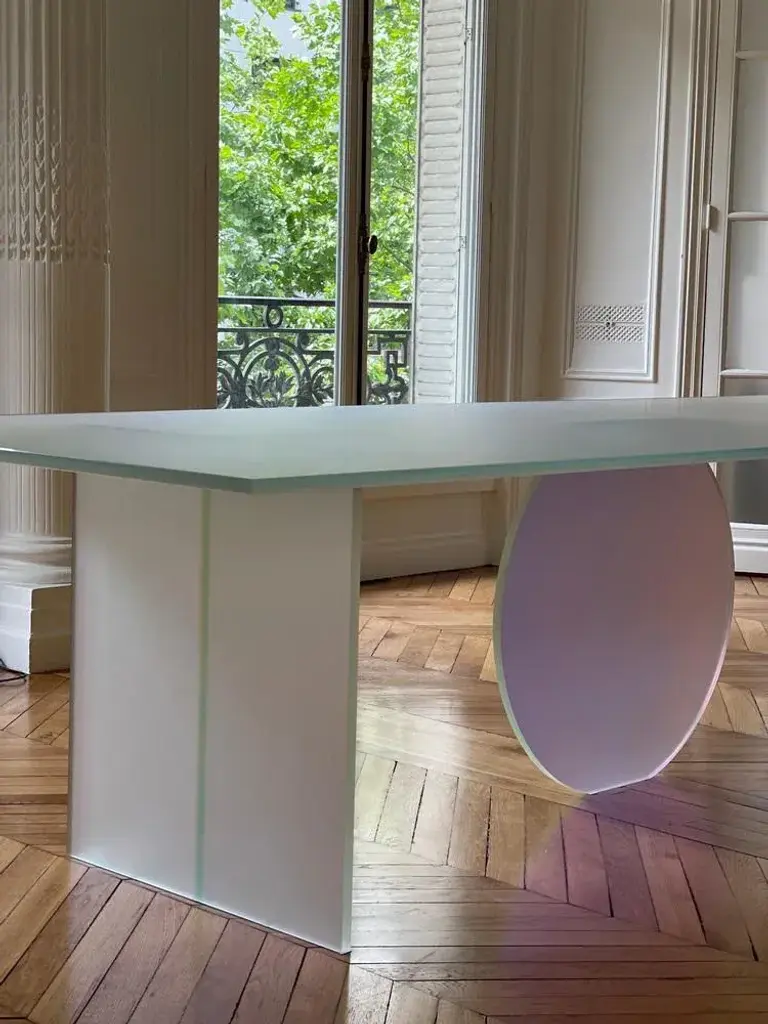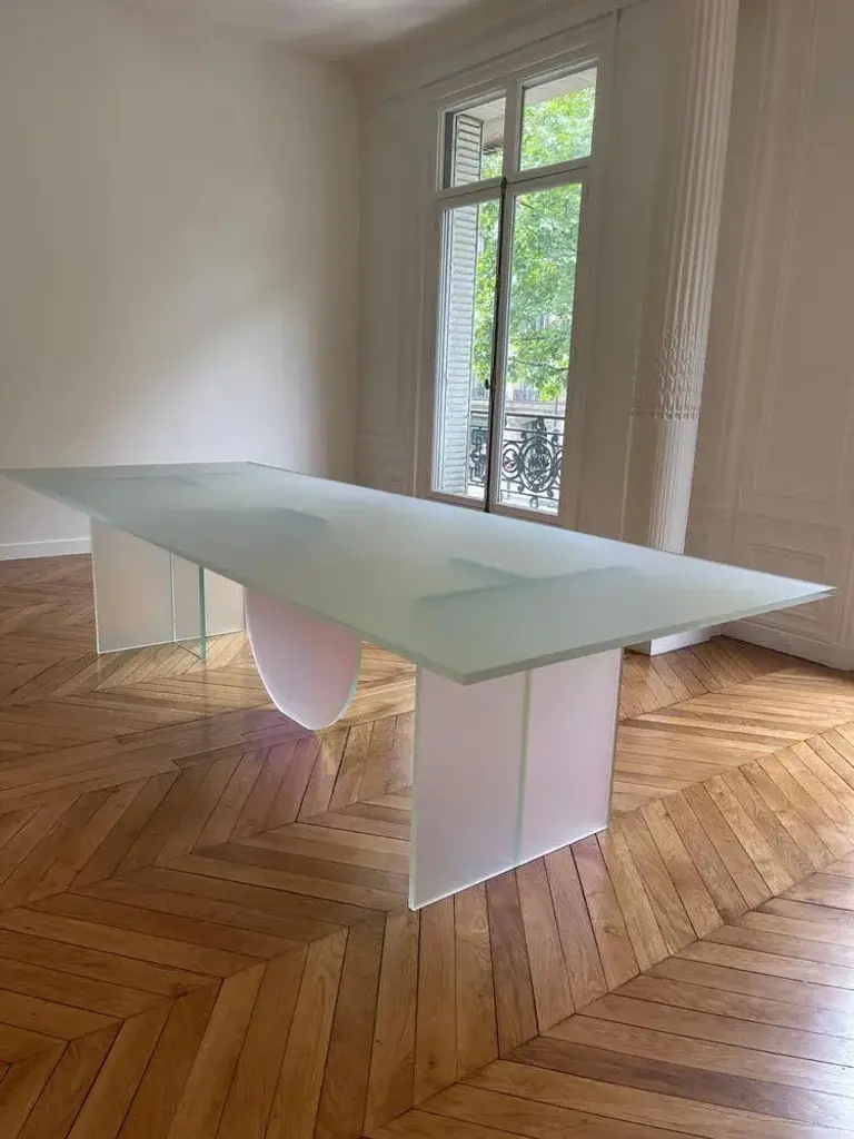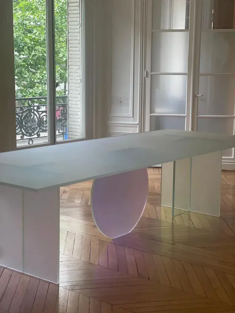 Isola satin dining table by Brajak Vitberg One of a kind. Dimensions: H 75cm x D 320 cm x W 120 cm. Materials: laminated dichroic satin glass. The table is made out of glass with satin finish and dichroic insert. The colors in this kind of satin finish are more subtle but still change depending on point of view. Due to the size of this particular table, on site assembly is required. Dimensions are customisable. Please contact us. Brajak Vitberg is art and design studio, founded by two architects from Ljubljana, Slovenia in 2019. The studio creates a range of products from handmade and limited small series to one piece unique products, inspired by materials and forms that create incomplete perfection.Bijelic and Brajak are two architects from Ljubljana, Slovenia. They are striving to design craft elements and make them timeless through experimental designing process.