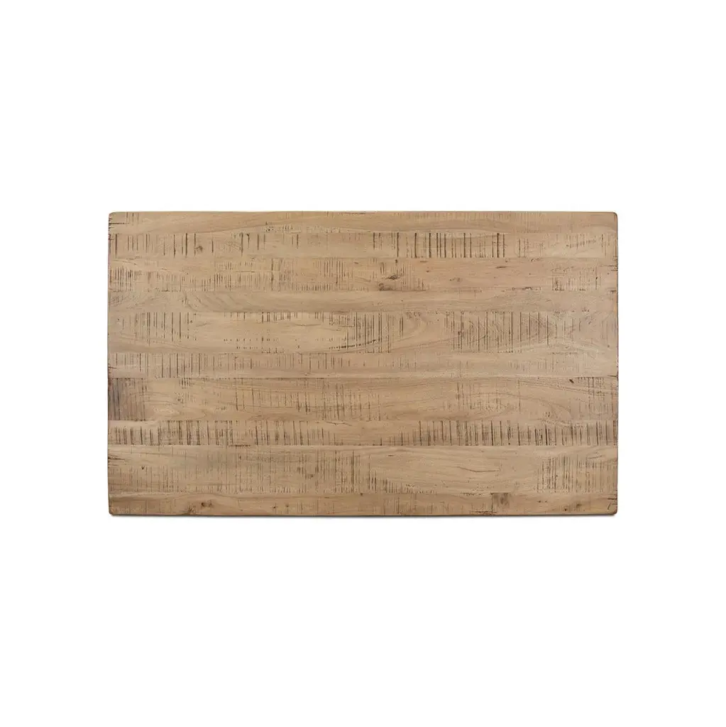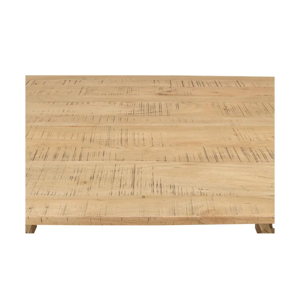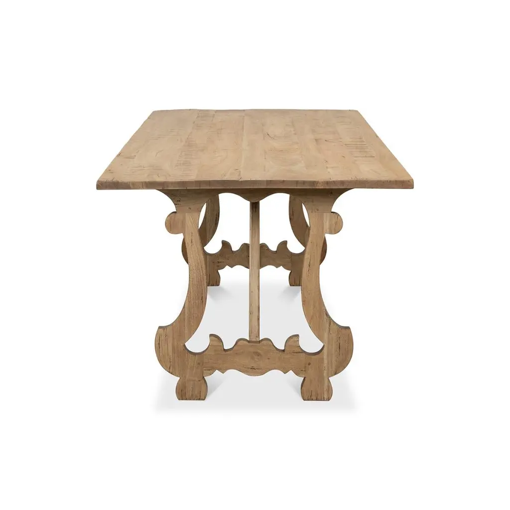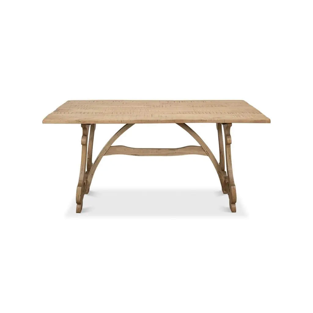Dining Table in an unusual light drift walnut finish, with plank board top above a trestle end base with a stretcher.Dimensions: 63" W x 37" D x 30" H