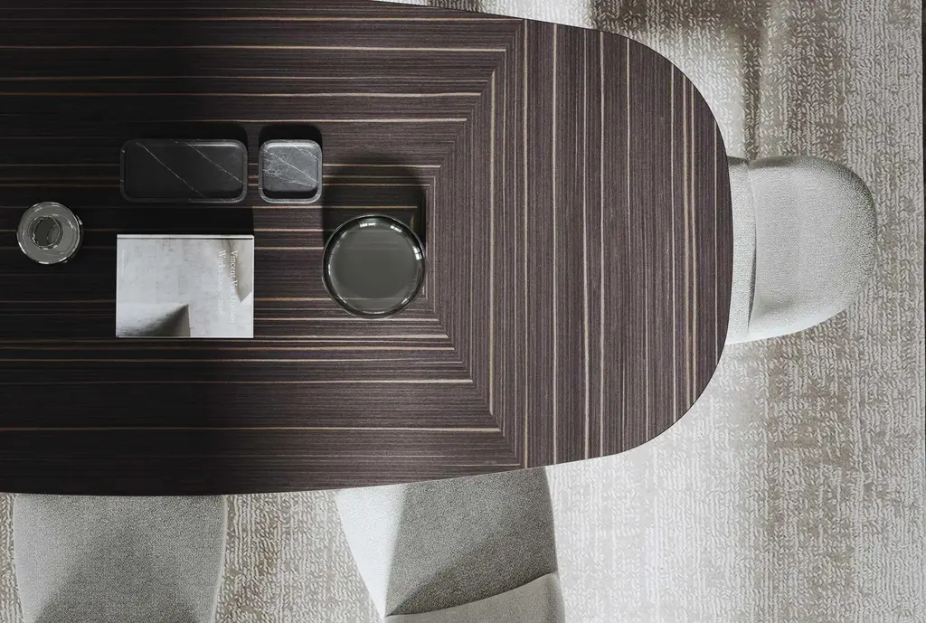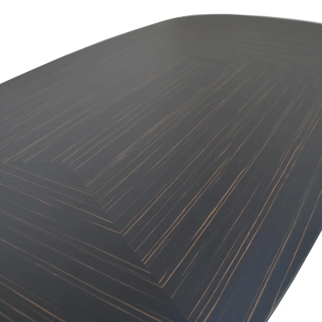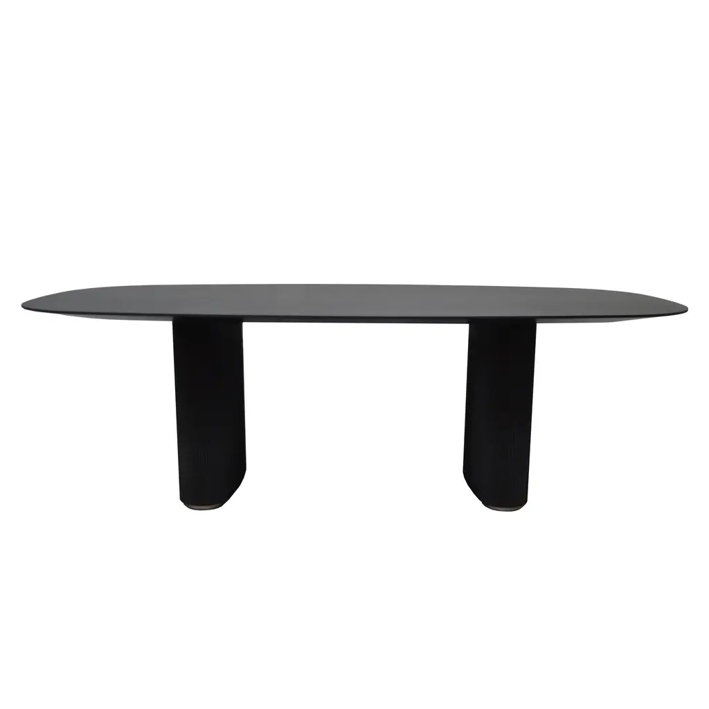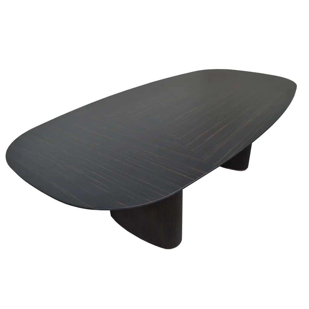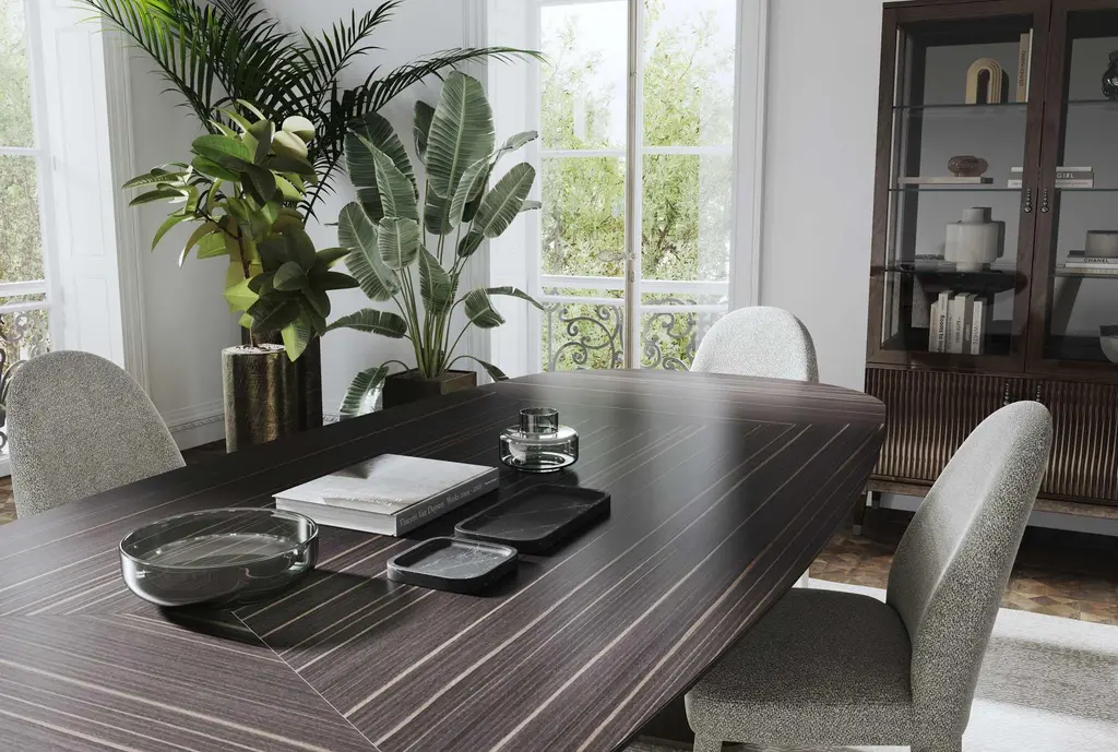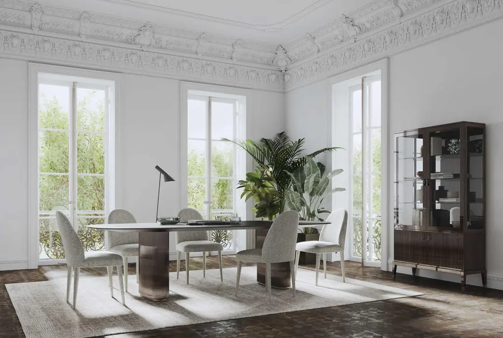 This dining table takes its inspiration from the Art Deco designs. It combines the use of mahogany veneer with bronze finishing detailing. The elegant shape and proportions of the table, along with the excellence in craftsmanship, make this a beautiful dining table which is both highly functional and distinctive in appearance. This beautiful table would make a fascinating piece for a dining or a living room. It’s been beautifully finished for a smooth texture that looks highly decorative. Despite its sharpness, the warm, dappled colors of the table allow it to seem cozy and noble, rather than harsh. Oval legs in turned linden with column effect. Made to order in two sizes: 240 cm and 280 cm .