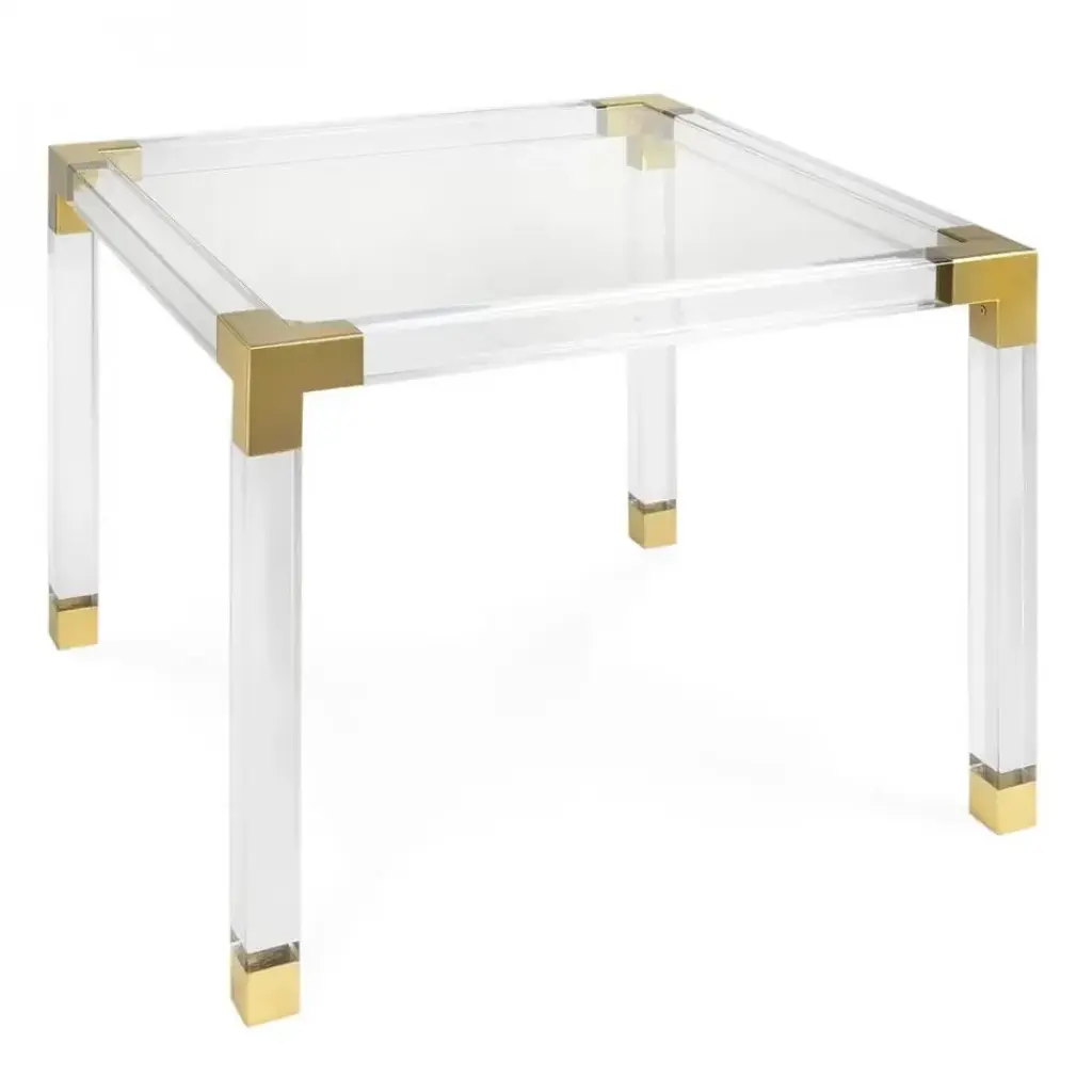 Clearly Cool. Featuring luxe clear acrylic with brushed brass corners, our Jacques Dining Table seats up to six for a chic dining experience. Swag an architectural chandelier overhead and pair with sculptural seats—like our Maxime or Goldfinger Dining Chairs—for a grounding effect. The perfect blend of simplicity and glamour, modern and traditional. Big presence, weightlessly transparent.