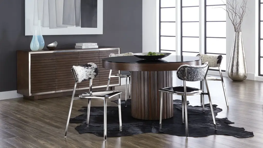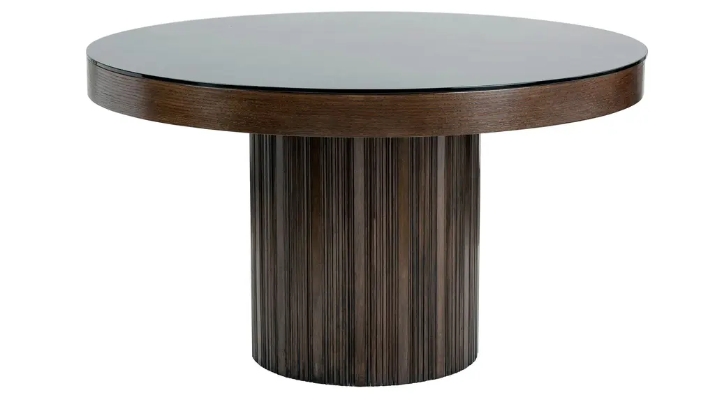 Jakarta Dining Table features an etched base crafted from solid espresso wood. Black tempered glass rests atop the table for a clean, transitional look.