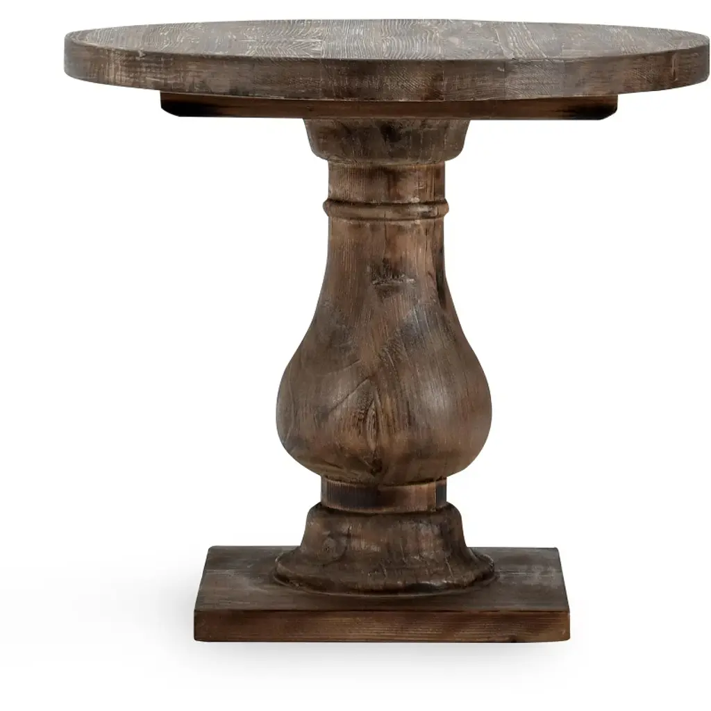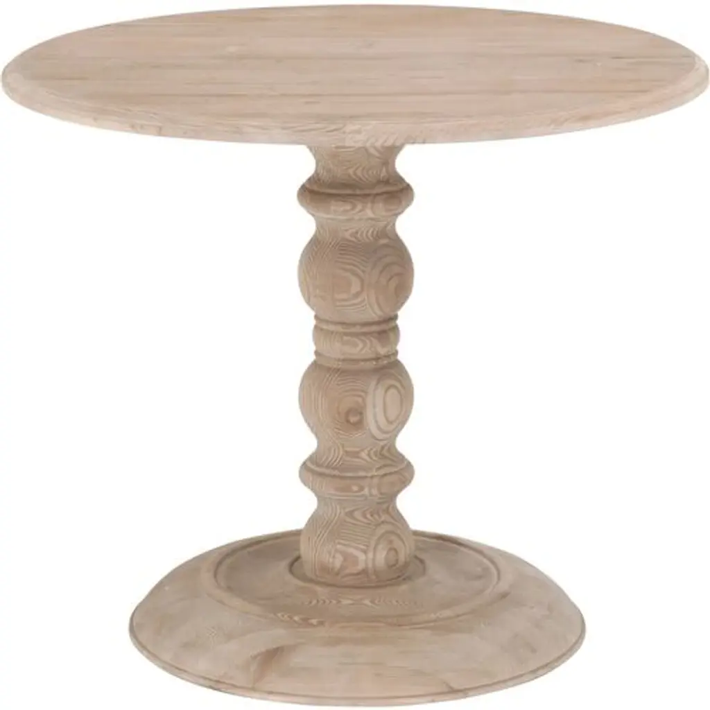 Lavishly figured reclaimed pine brings an organic warmth to this sculptural dining table. Three feet in diameter, this table can accommodate four people in both comfort and style.