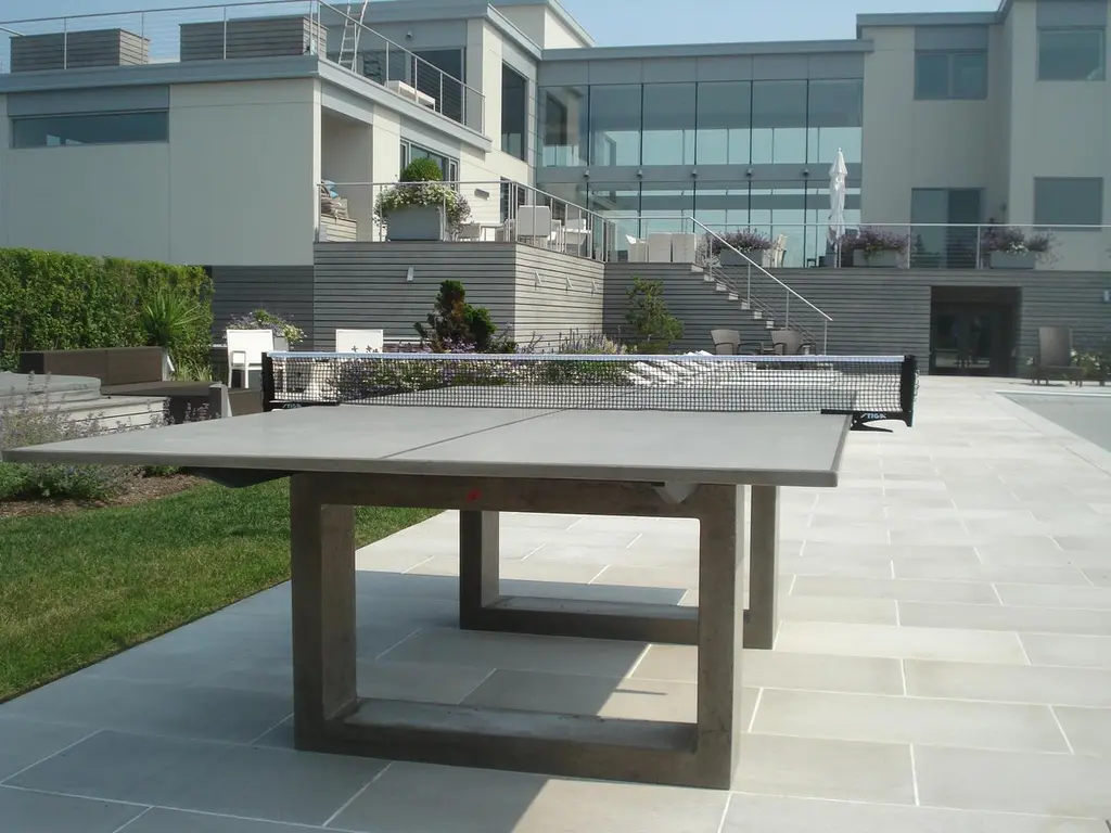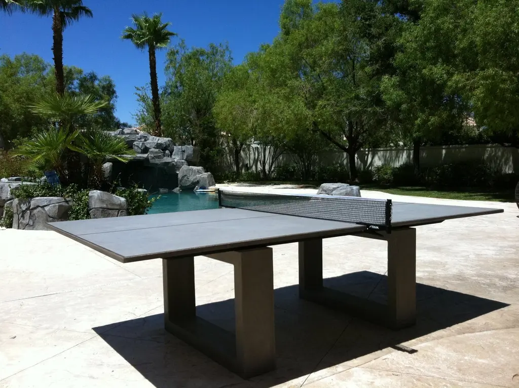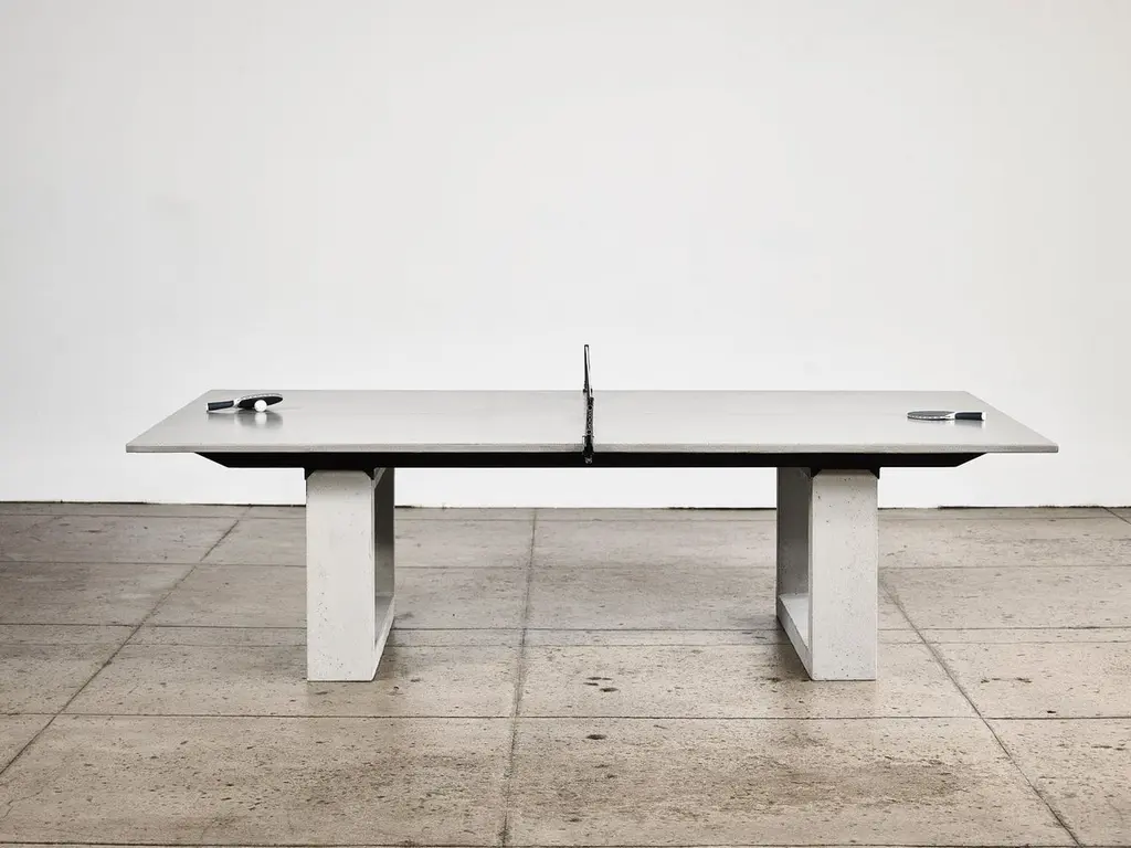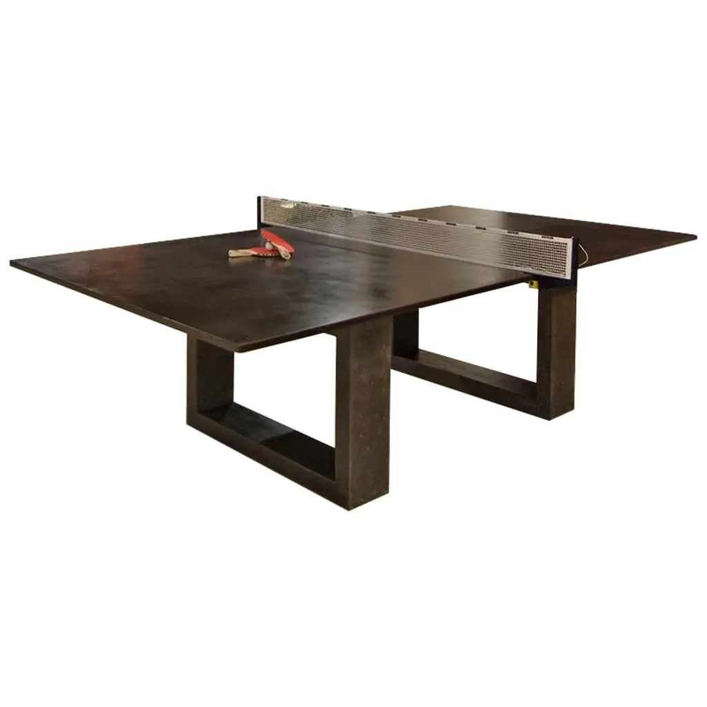 James de Wulf custom contemporary concrete Ping-Pong Table. Regulation sized with acid stained center line and carbon fiber reinforcement. Add seating to welcome guests as a dining table. Seats 10-12 guests comfortably.Tables are sealed with a unique finishing wax and will develop a gradual patina adding to the beauty of the material’s character over time. Table weighs 900 lbs. Suitable for indoor and outdoor use. Available Colors: •Light Grey •Natural Tone •Dark Grey•BlackRemovable net and game accessories are included.Outdoor cover recommended. Custom covers available.