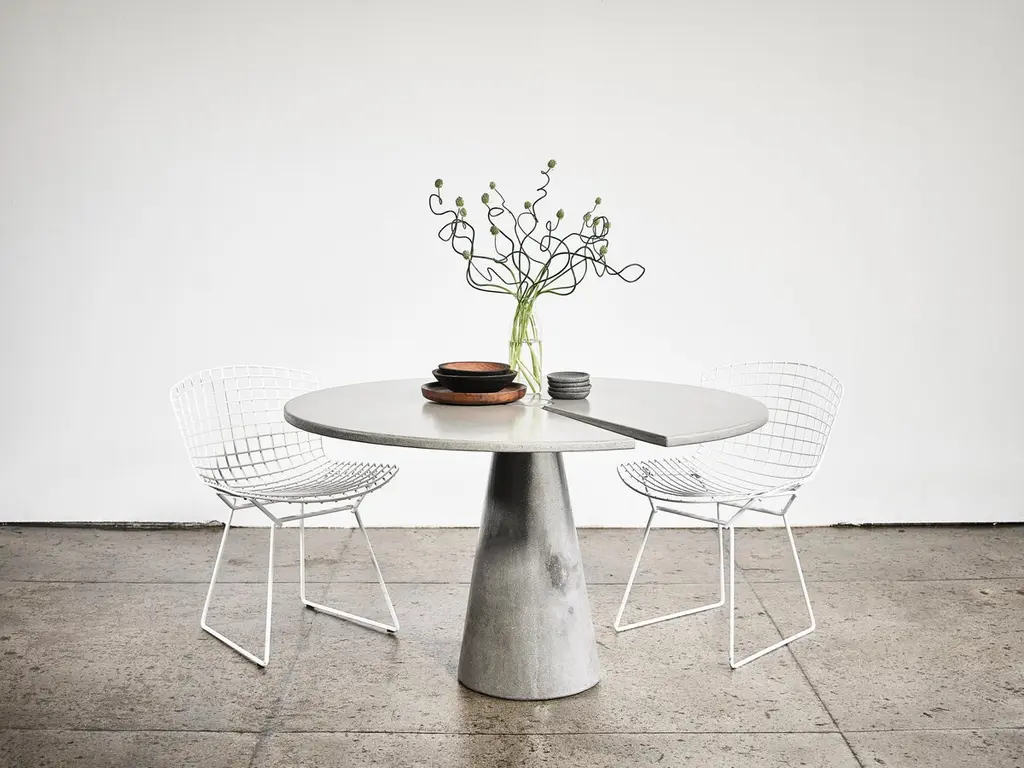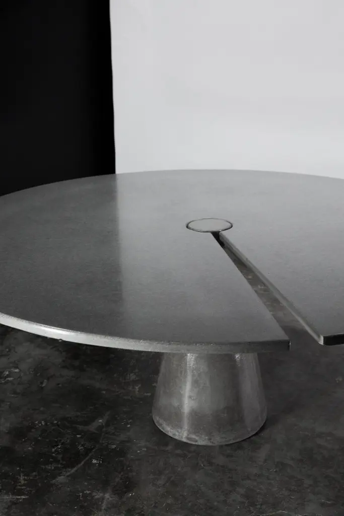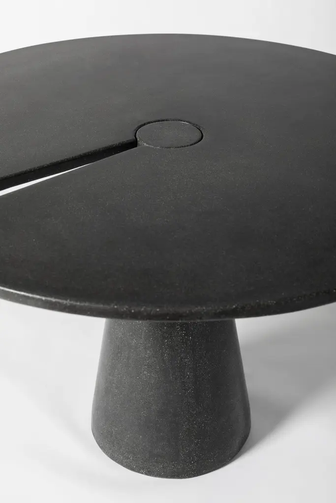 The James de Wulf Classic split locking dining table features a split radius in the tabletop. The table consists of two pieces: table top and base, which are locked together by gravity alone. Equal in art and utility, as a collector's piece and as a functional dining table. The table's style and concrete construction will withstand the test of time, maintaining its presence as a modern heirloom. Its brutal concrete design centers a room while the split evokes flow. Measure: 72".Suitable for indoor and outdoor use.Colors available in Natural tone, Light grey, Dark grey, and Black.Sizes available in 48, 60, and 72 inch diameter; price varies accordingly.James de Wulf has been widely recognized for his original and innovative work with concrete design and rapidly became known for his ability to fuse advanced concrete technology with aesthetic, modern, and natural concrete forms to constitute functional art.