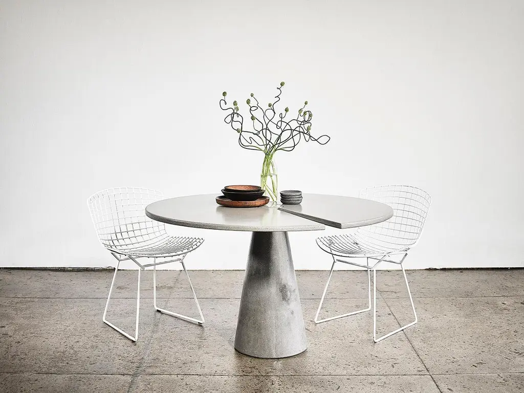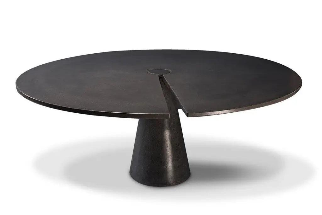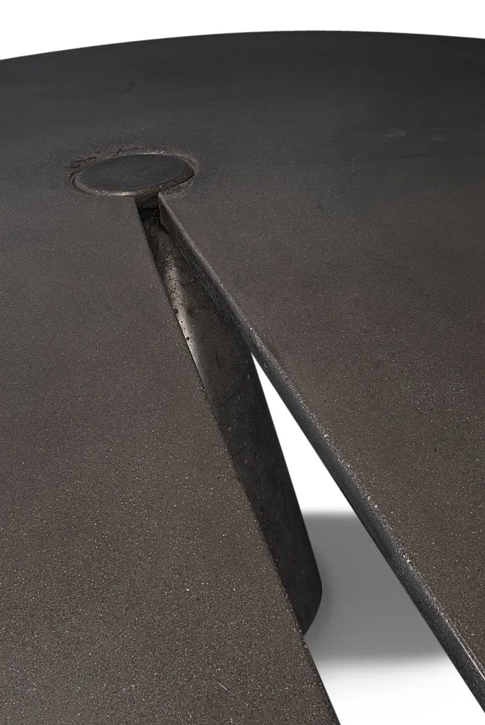 The James de Wulf classic Split Locking Dining Table features a split radius in the tabletop. The table consists of two pieces: table top and base, which are locked together by gravity alone. Equal in art and utility, as a collector's piece and as a functional dining table. The table's style and concrete construction will withstand the test of time, maintaining its presence as a modern heirloom. Its brutal concrete design centers a room while the split evokes flow and balance.Shown in 72 inch diameter in Black.Available in Natural Tone, Light Grey, Dark Grey, Black.Also available in 48 inch diameter and 60 inch diameter.James de Wulf has been widely recognized for his original and innovative work with concrete design and rapidly became known for his ability to fuse advanced concrete technology with aesthetic, modern, and natural concrete forms to constitute functional art.