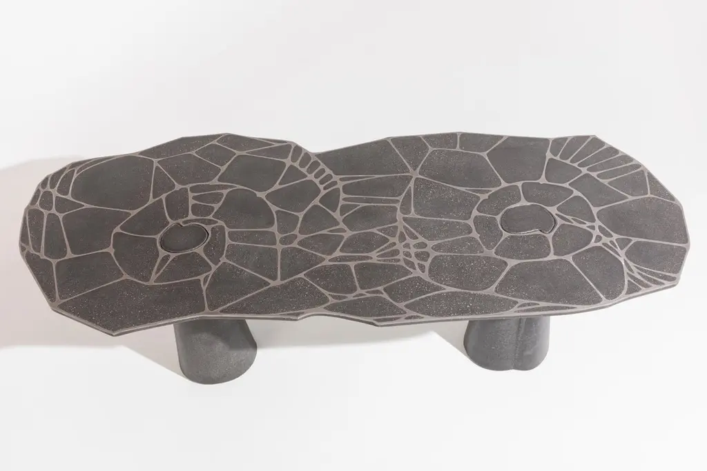 The EXO series is an exploration of nature's growth patterns on design materials, to understand the perfect structure of exoskeleton. The project was conceived from a culmination from James de Wulf's 17 years of concrete knowledge; from the gravity joints to the seamless finish. The beauty of stainless steel, ductile and resistant to corrosion, married with the strength, porosity, and density of concrete, create the perfect union. Each material benefits from the other's properties. With the union of these two materials in this patented process, tables are stronger, thinner, and organically unique."The design is based on the skeletons of Radiolaria which are microscopic organisms found on the ocean floor. The outer edge of the table meanders in an organic way rather than staying in a rigid circle. The leg does as well. In this way we keep the piece human, approachable and fun; rather than adhering to the rigidity of a circle." - James de Wulf.