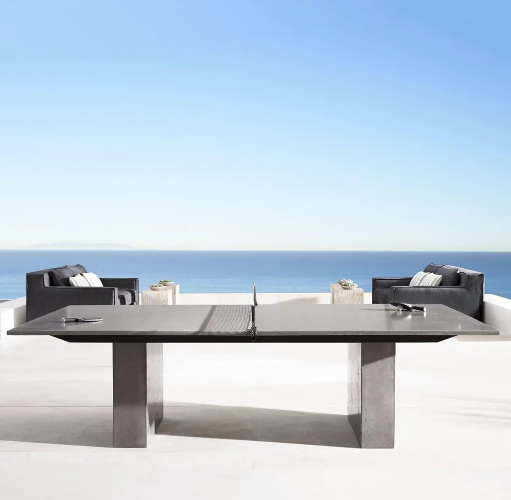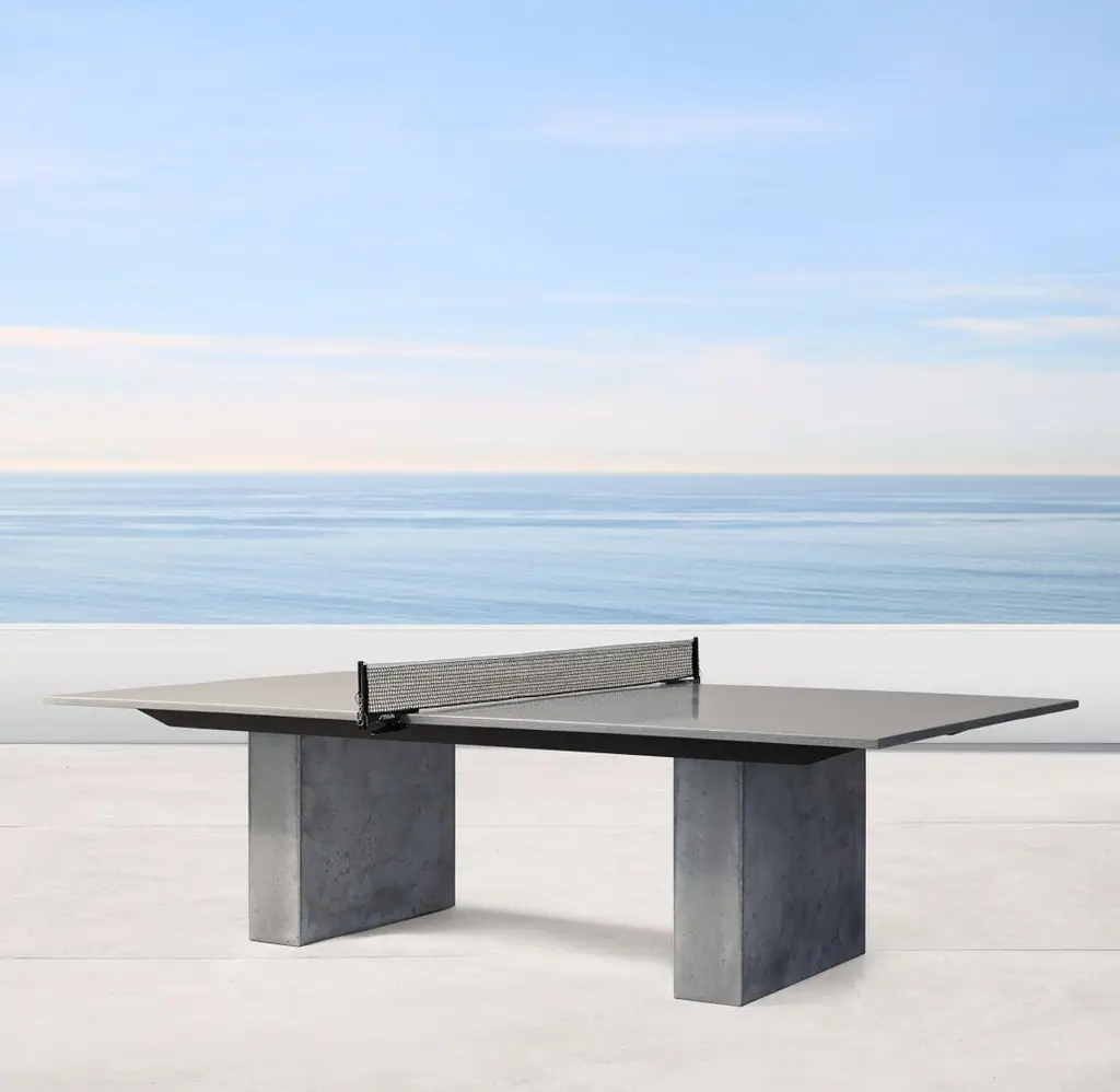 A special re-edition of the classic James de Wulf Ping Pong table, this one features a pair of solid concrete legs with a raw edge detail. Regulation size with an acid stained center line. The reinforced, cast-concrete tabletop, features a smooth high-performance finished surface. Its elegant, yet brutal design is a pleasure to play on.Add seating to gather as a dining table.Tables are sealed with a unique finishing wax and will develop a gradual patina adding to the beauty of the material’s character over time.Suitable for indoor and outdoor use.Protect the finish by covering when not in use outdoors. All-weather custom covers available.