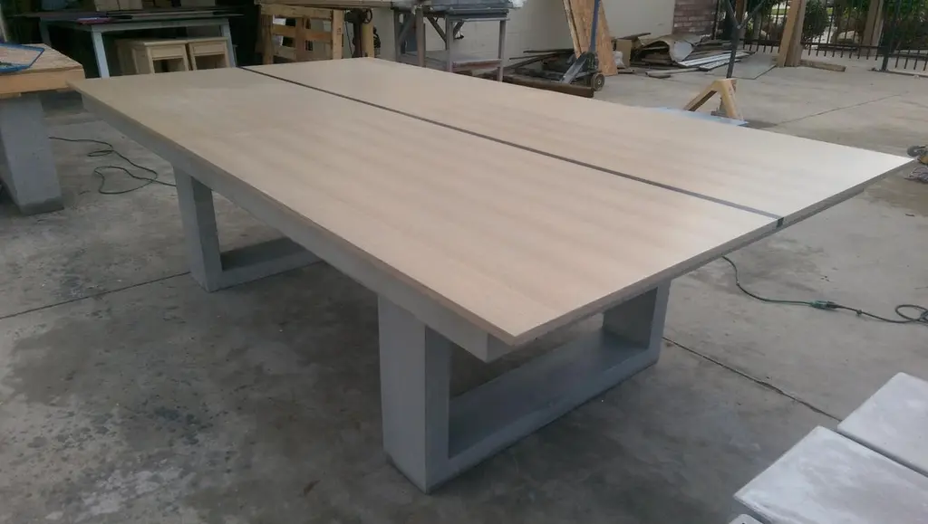 A white oak ping pong and dining table top for effortless conversion of the James de Wulf Billiards Table. The handsome white oak is chosen in this application for its strength, weight, and durability. The oak wood is hard and dense with a very close grain. White oak's high tannin content makes it resistant to insect and fungal infestation. Total weight of the tops is 75 lbs.Suitable for indoor and covered outdoor use. Outdoor cover recommended. Custom covers available.Concrete Billiards Table, not included, can be found on 1st Dibs under: "James de Wulf Custom Concrete Billiards Table."