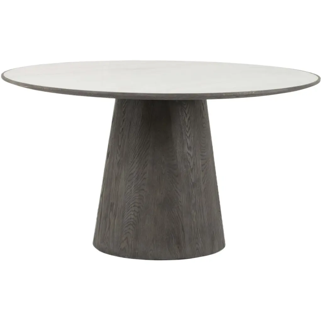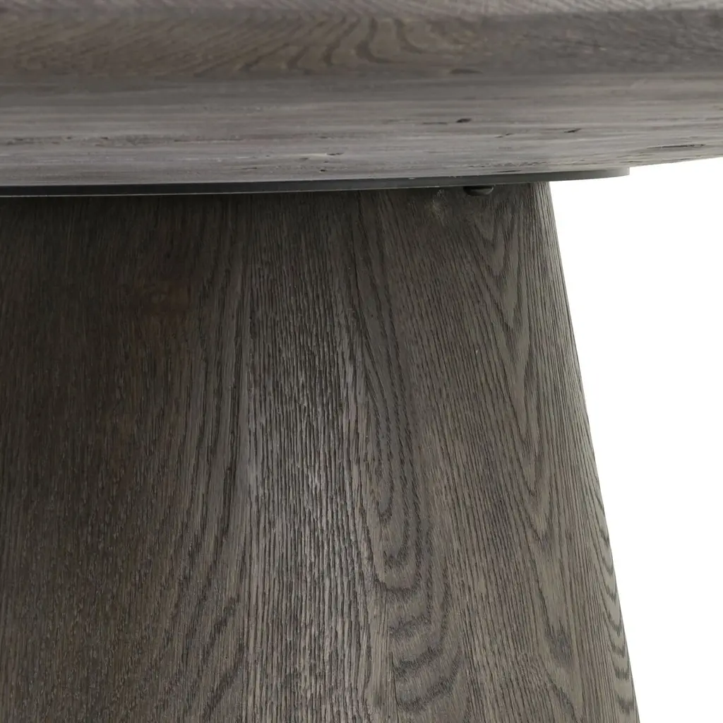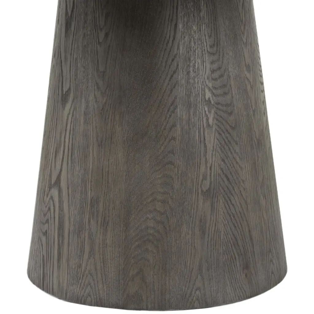 Mixed materials make for great drama. A cone-tapered base of dark, weathered oak supports a rounded tabletop of solid marble, with oak banding on the edges for thoughtful contrast.