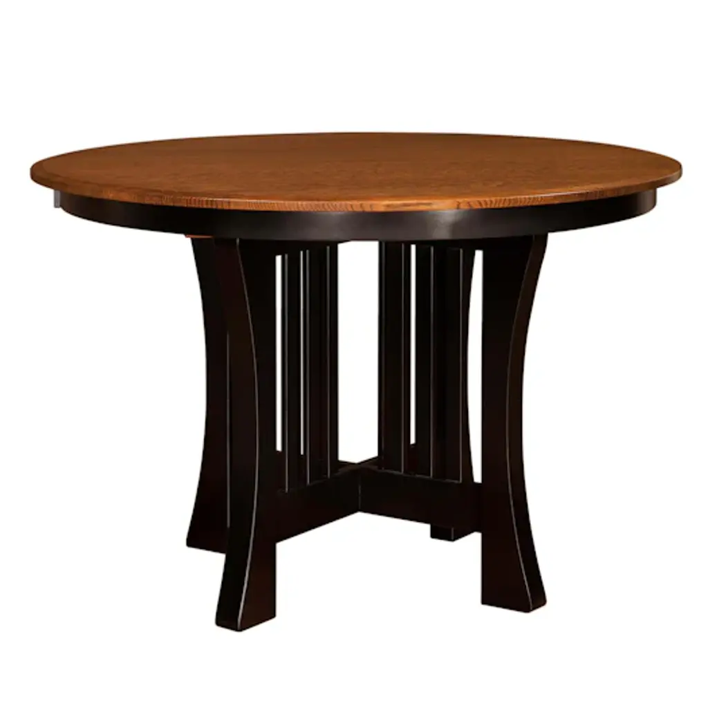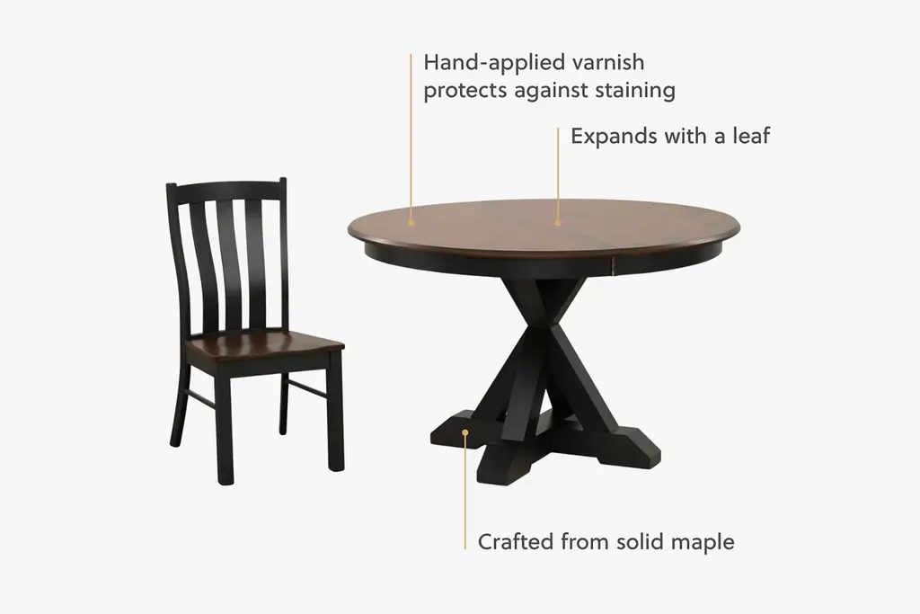 Our Jamestown dining table will be a staple for your future gatherings. Crafted from solid maple wood, this classic piece sits on a pedestal base and can be expanded to make space for everyone and more. This piece is available in a 36", 42", 48" and 54" table size.