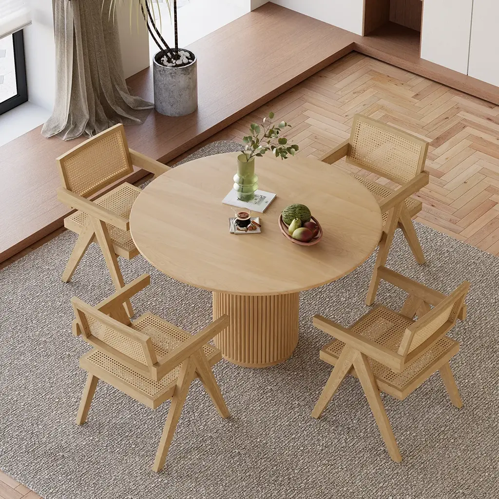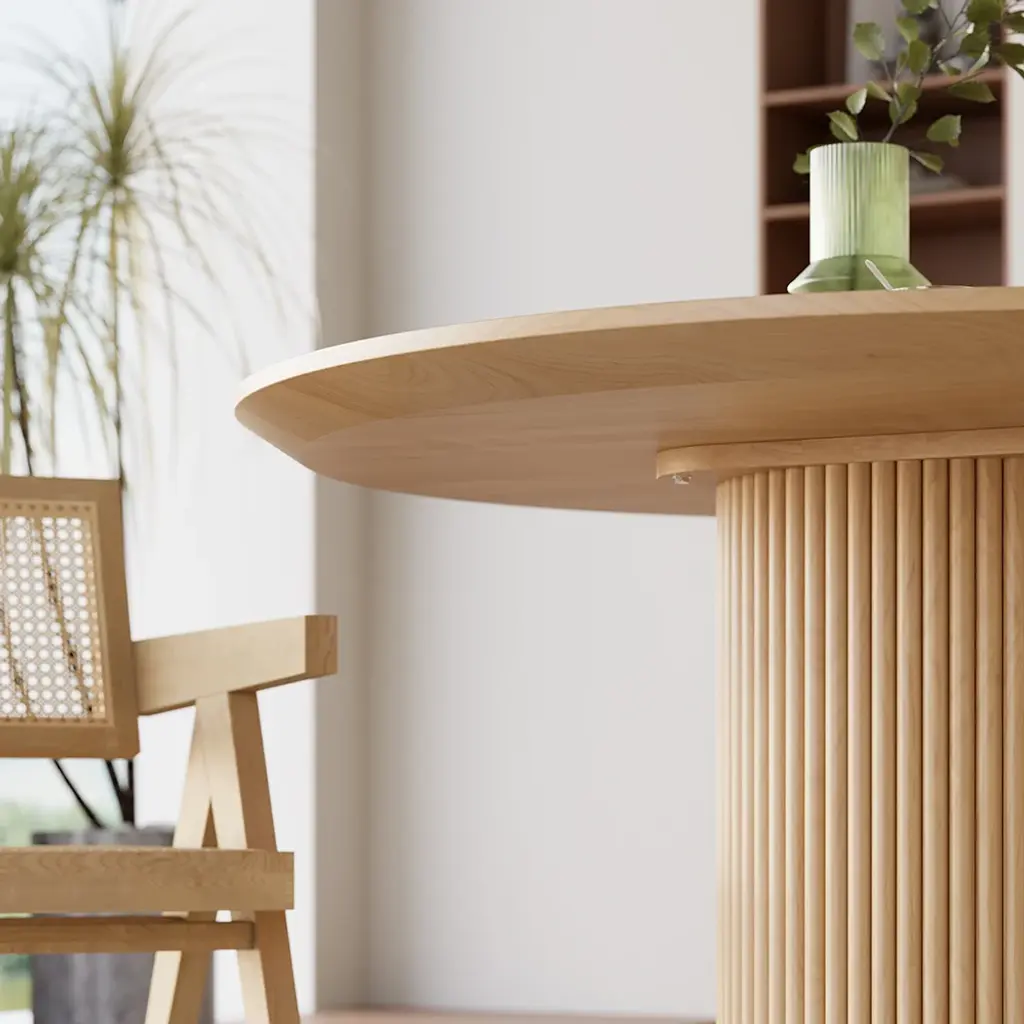 This 39.4" round dining table blends Japandi minimalism with natural warmth, perfect for small dining nooks or apartments. Crafted from solid pine with a natural finish, its ribbed base combines beauty with sturdy stability, creating a soothing yet sophisticated atmosphere in your dining space.
