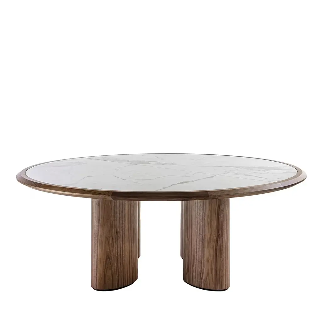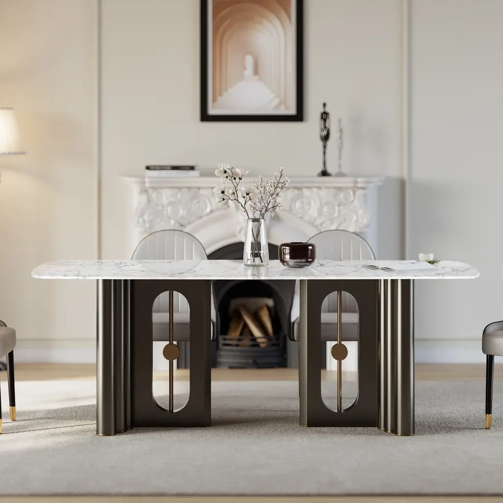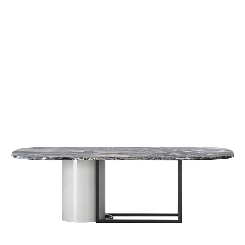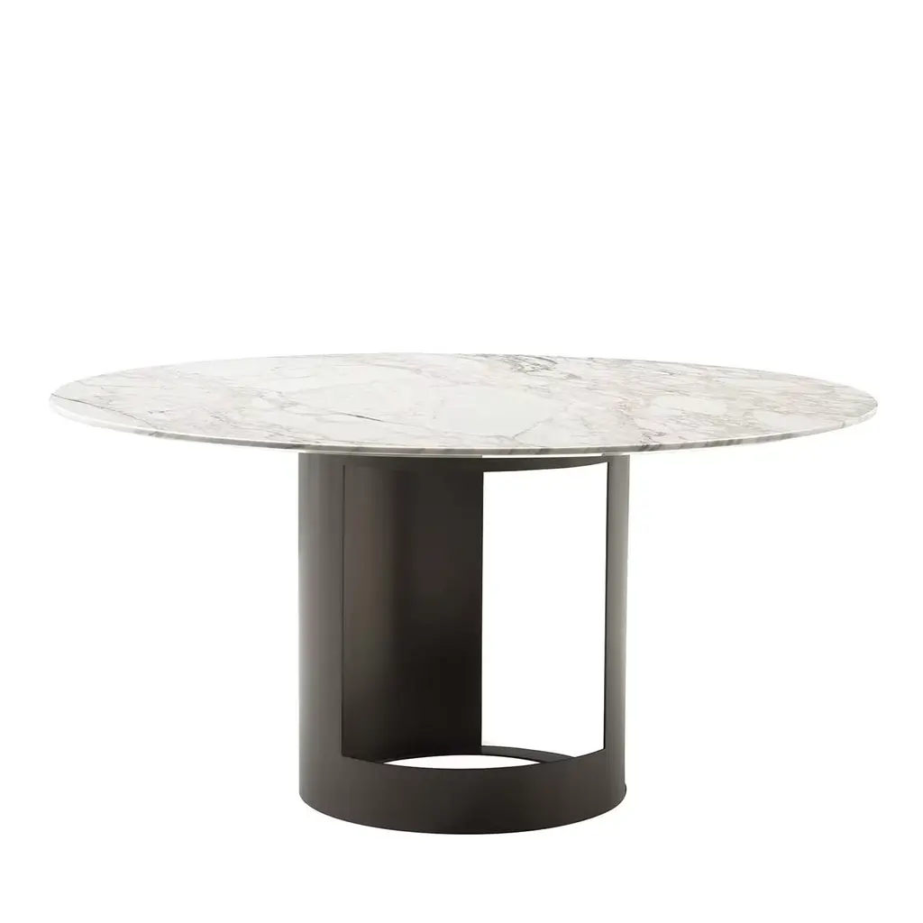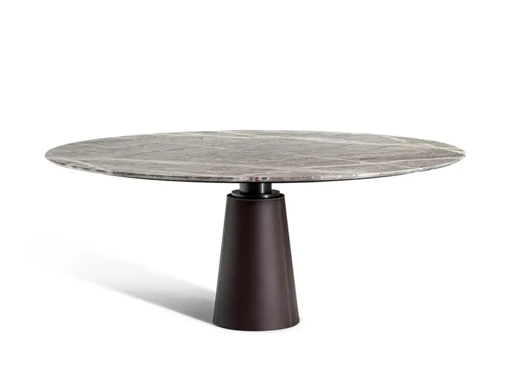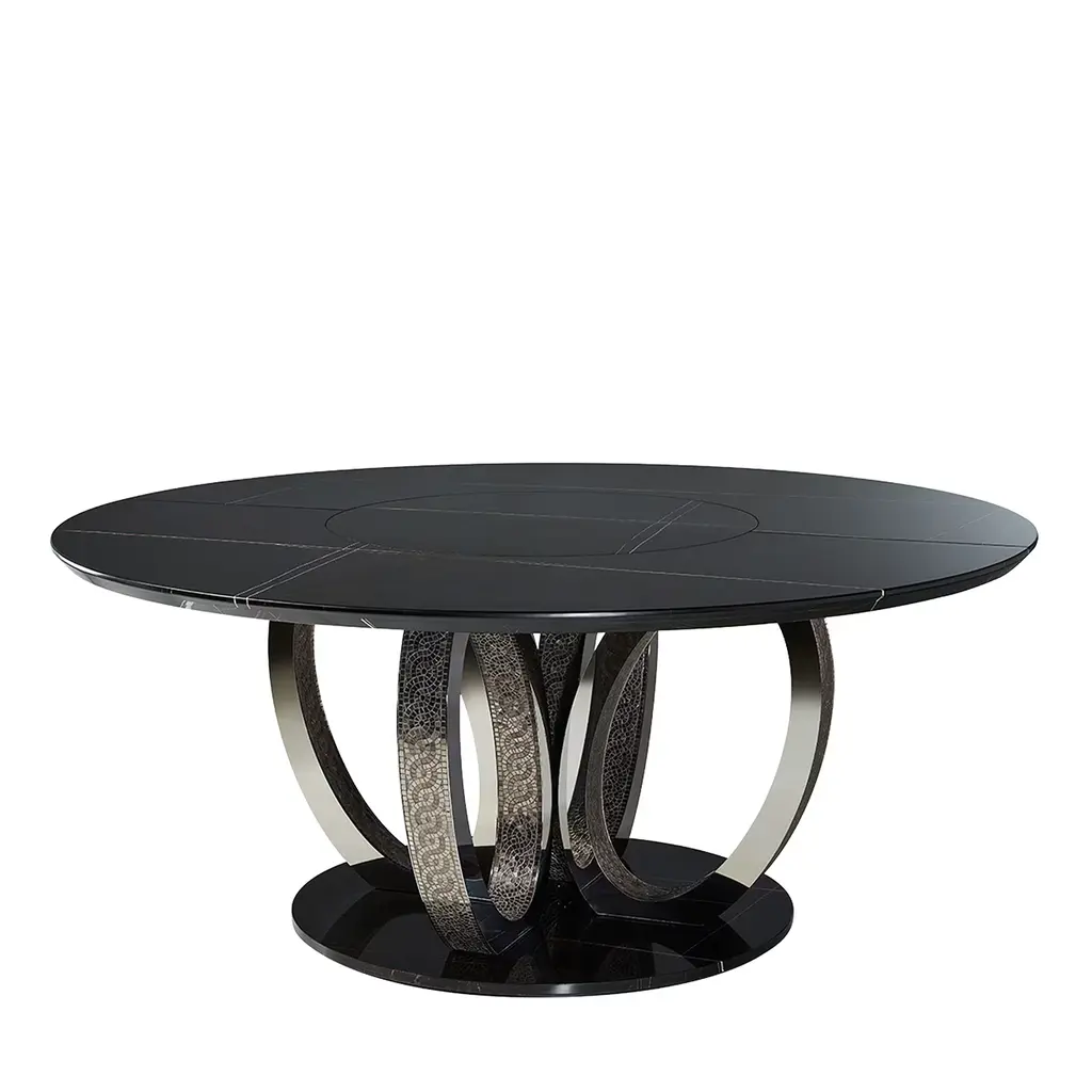 The Jason dining table features a top made of green marble with decorative pieces in red and white, complemented by polished metal inserts. The Lazy Susan mosaic includes two sections: one in light gray-veined stone and the other in red-toned stone. The undertop is finished in a glossy black tone. The external frame is wrapped in smooth chocolate-colored leather, and the metal components have a satin black nickel finish, adding sophistication to the design.
