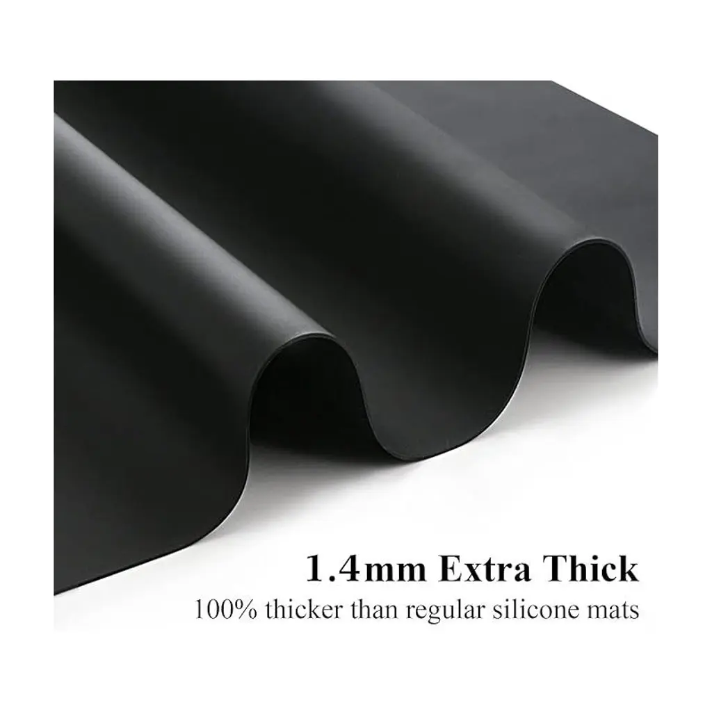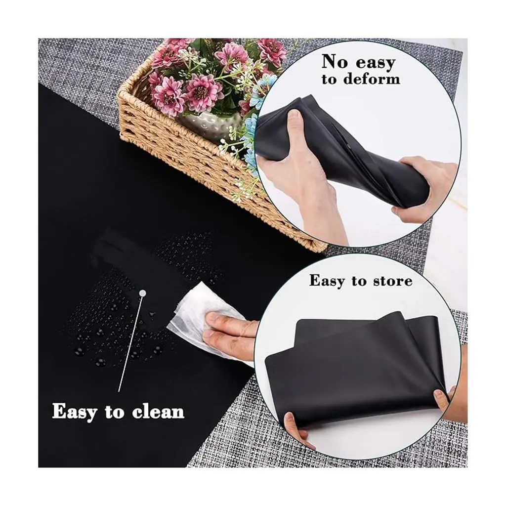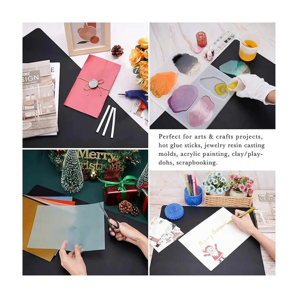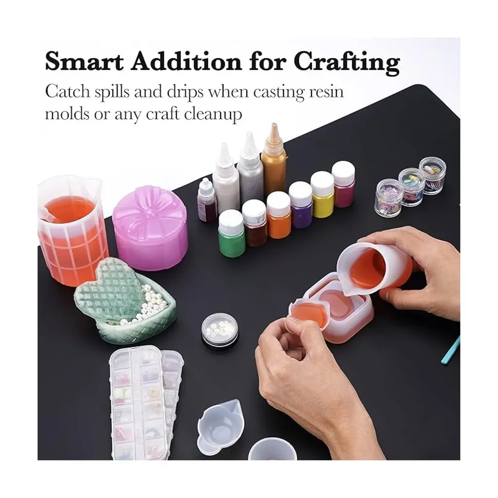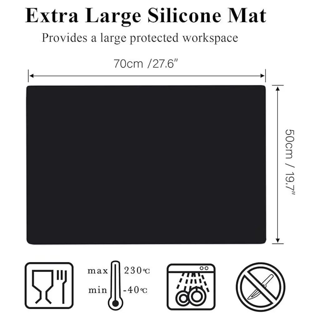 OVERSIZE - 1pcs of BLACK huge extra large size silicone sheet 27.5 in x 19.6 in x 0.06 in / 70cm x 50cm x 0.14cm, perfect size and thickness for a table saver, provides a large, protected work space. A side is nonskid smooth surface (use this face down), the other side is nonstick frosted surface (use this face up).QUALITY MATERIAL - The X-large crafts silicone mat is made of 100 percent food grade silicone, heat resistant between -40℉ and 446℉. flexible,non-skid, nonstick, waterproof, heat-resistant, non-fading, non-staining, durable, reusable, not easy to deform or tear up, great for casting tools kit collector.SURFACE PROTECTOR - Counter mat can protect your desk countertop against water, stains, discolorations, scratches, burn, grease and keep your crafting table away from resin, epoxy, glue, glitter, paint, ink, oil, scratches etc. Place it under hot pot, microwaves, air fryer, induction stove, toaster, coffee maker, oven among other appliances to protect the countertops.It also can keep the furniture away from dust.MANY USAGES - An multipurpose silicone mat pad for art & craft projects (glue gums, wax, candles), mat for casting molds, epoxy resin jewelry casting molds mat, paper crafting, painting, sewing, nail art, clay/play the dough, pottery, scrapbooking, workshop glue ups, placemats, fondant, pot holder, coasters, dish mats, tableware, trivet, drains, pet feeding, heat insulated pads, dining tables, kids play table, kitchen counter top protector, etc.EASY CLEAN & EASY STORAGE - The painting mat is washable and dry quickly, easy to clean with water and dishcloth, lightweight and portable, easy to fold or roll up, takes up minimal space.