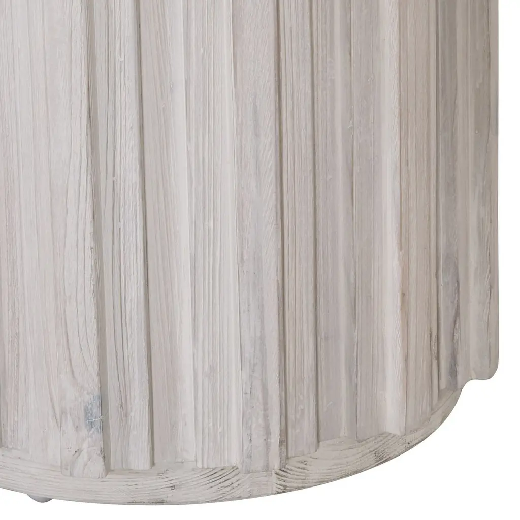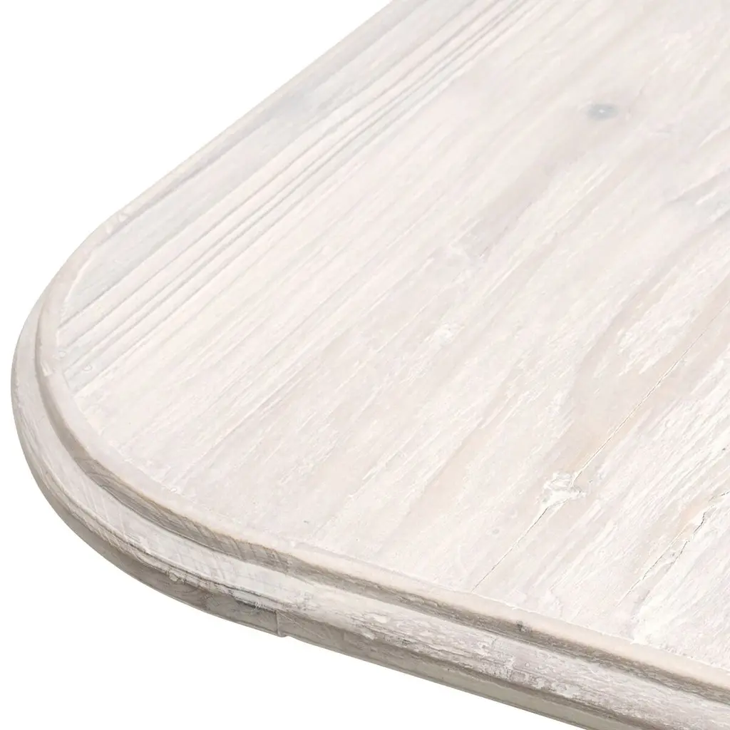 The fluting of the pillar legs is the first thing you notice about this eye-catching dining table. Also notable are the rounded corners and angled edges of the tabletop and the whitewashed finish of the richly figured reclaimed pine. More than seven feet wide, the table seats eight people.