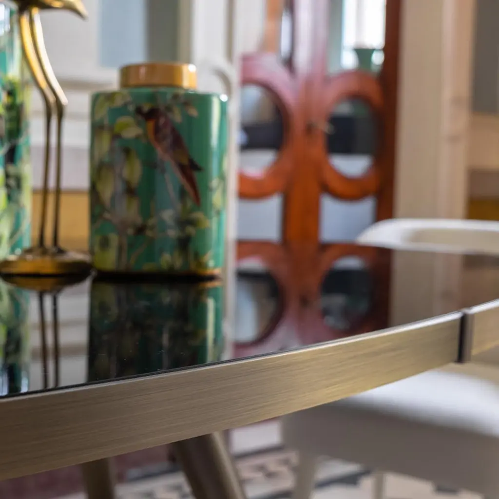 Part of the Jerome collection, this modern dining table features a brass-plated metal base with four canted legs whose satin finish splendidly complements the superb oval top of black-lacquered glass (4 cm thick). The harmonious silhouette and contemporary design of this table pair perfectly with the black Pauline dining armchair to create a sophisticated ambiance in a modern dining room. Top is also available in marble.