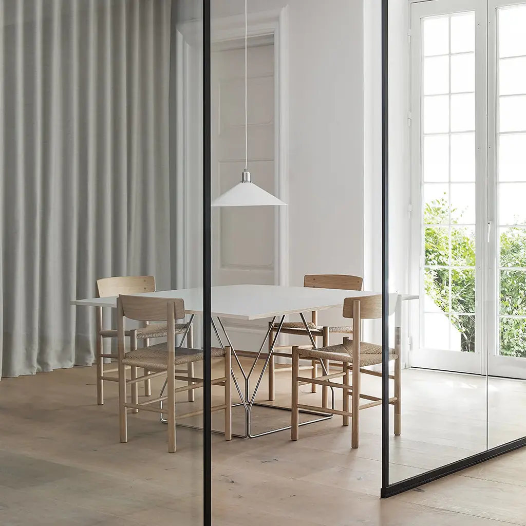 The JG Table expresses designer Jørgen Gammelgaard's desire to create a simple, elegant design with a supportive structure that would not limit the seating around the table. Providing remarkable stability, as well as an intriguing graphic aesthetic.