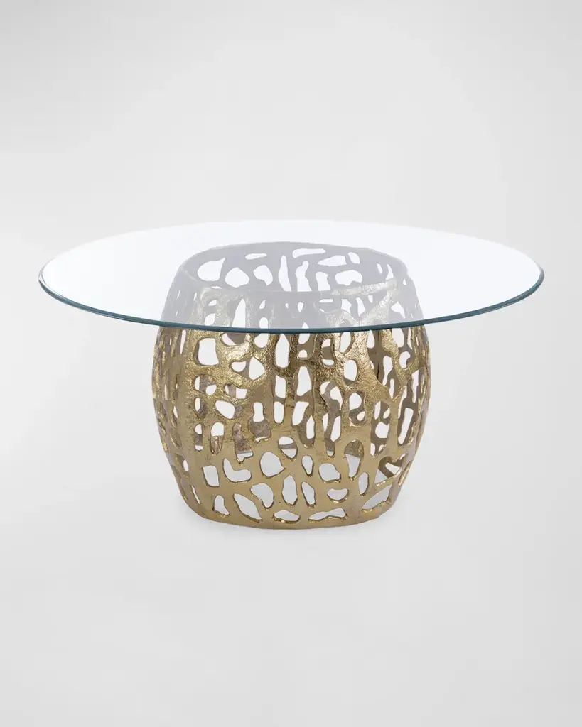An organic cast aluminum dining table base with an antiqued gold finish gives aesthetic interest with its free-form cutout pattern and round glass top. Handcrafted of aluminum and tempered glass Overall, approx. 60"Dia x 30"T Finished back Includes hardware Assembly required Imported Weight, 110.0 lbs Boxed weight, approximately 160.0 lbs Shipping Direct from Vendor, usually ships within 10 business days. About the John-Richard Collection Founded in 1980 in Greenwood, Mississippi, the John-Richard Collection is known for a strong design staff that travels the world for inspiration. Channeling cultural and historical influences, the company creates distinctive artisan-crafted furniture, lighting, wall art, mirrors, and decorative accessories that make a lasting impression. What's more, an eye for future trends in luxury home furnishing sets the John-Richard Collection apart. They skillfully blend the best of what is new in home fashion with the great designs of the past, resulting in updated designs that fit perfectly with an array of styles.