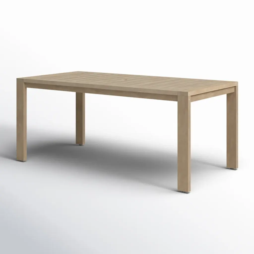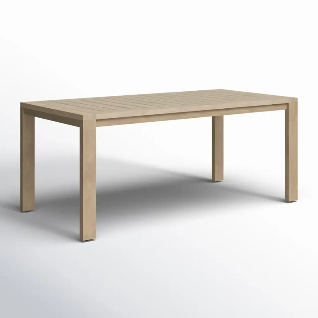 Contemporary coastal. Built from solid acacia wood, this outdoor dining table grounds clean modern lines with soft organic wood grains. It’s designed to stand up to weather, water, and UV-rays. A slatted top offers a classic backyard look – and lets rainwater fall right through, keeping puddles off the menu.