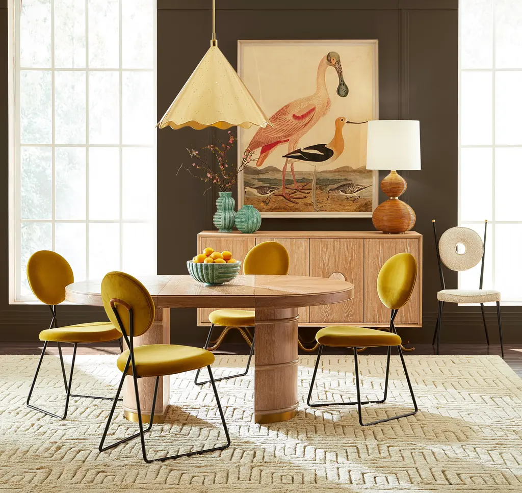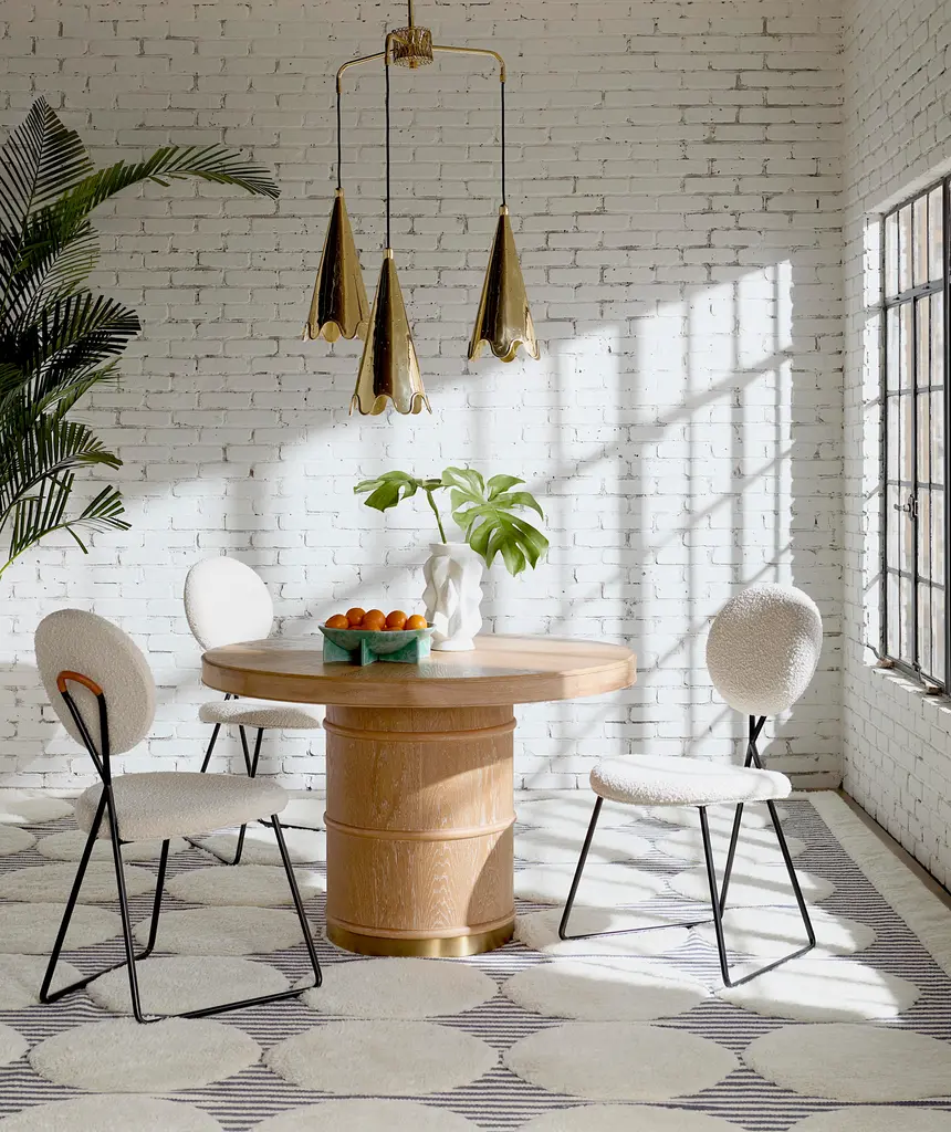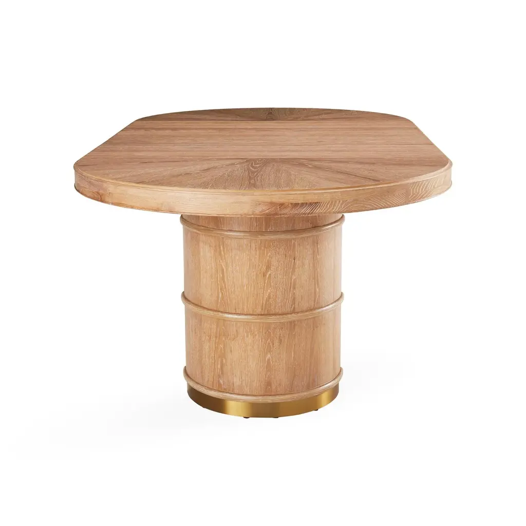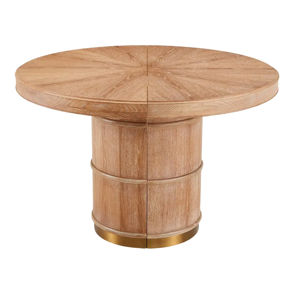A hardworking wire-brushed and lightly limed solid oak tabletop with a radial pattern on a bamboo-inspired, brass-banded base which splits to accommodate a two-leaf expansion. Chic and timeless. Seats up to 10. Our collection of artisan crafted solid oak furniture is as mighty as its source. Wire-brushing exposes the natural wood grain and our liming technique accentuates each solid piece of wood's unique pattern. A nod to French 50s cool, a dash of Milanese moxie, and a whisper of Scandinavian soulfulness. Care Instructions: Dust with a soft, dry cloth Spot clean with a damp cloth Never use harsh or abrasive cleaners that could erode our oak's satin topcoat Avoid contact with hot items Wipe spills immediately, do not allow water to collect on the surface