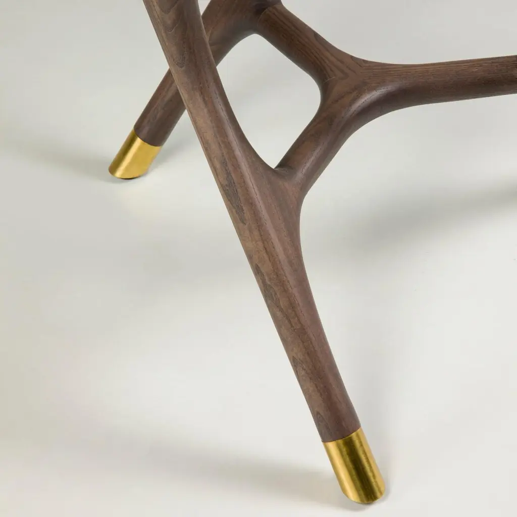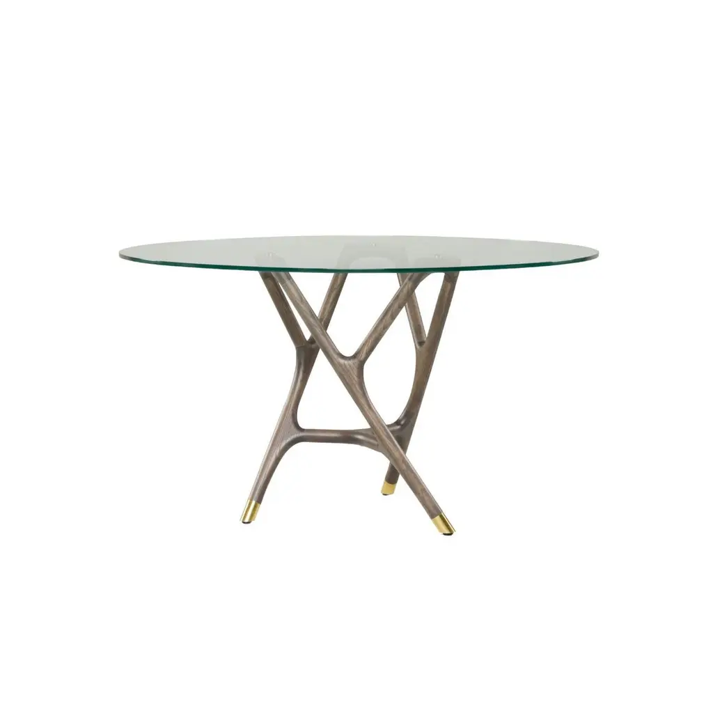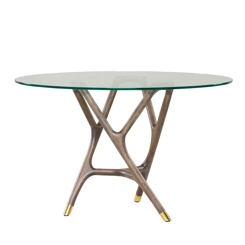 Contemporary style Joyce round dining table made of turned ashwood with glass top and brass tips.Designed by Libero Rutiloavailable in diam. 140cm