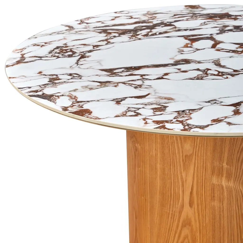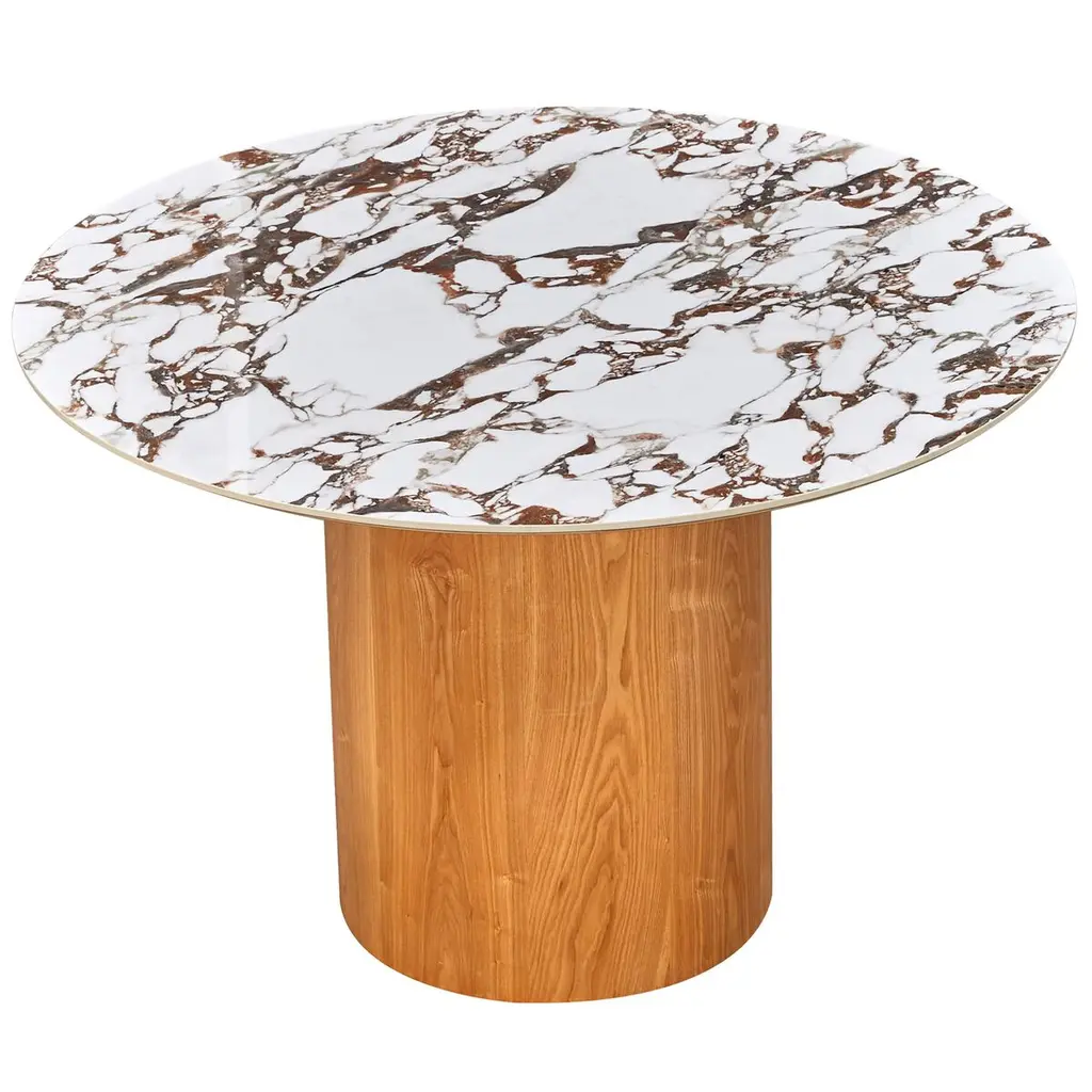 This handcrafted dining table's ceramic top has been given rich marbled veining that is enhanced by the tabletop's golden edging. The lavish grain of the wooden pedestal base provides an earthy complement. Nearly four feet in diameter, the table can seat four people.