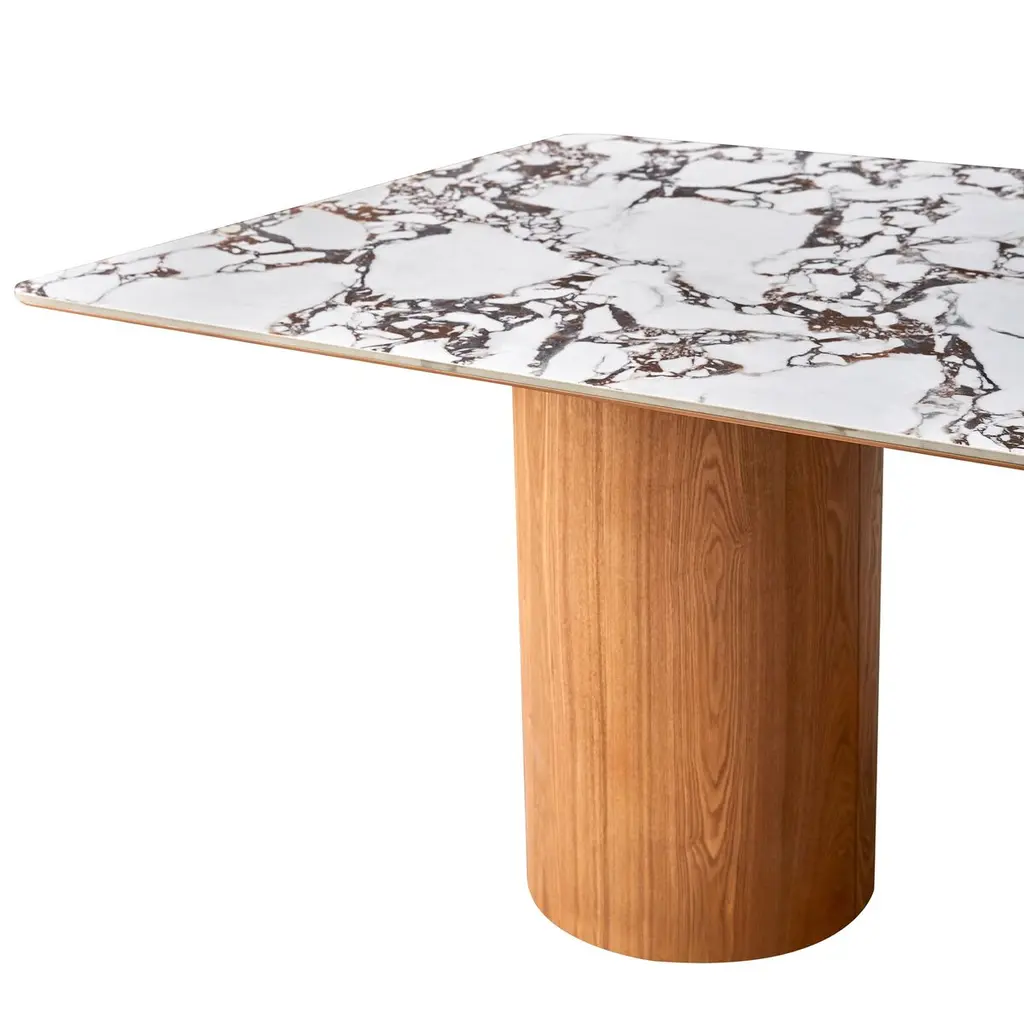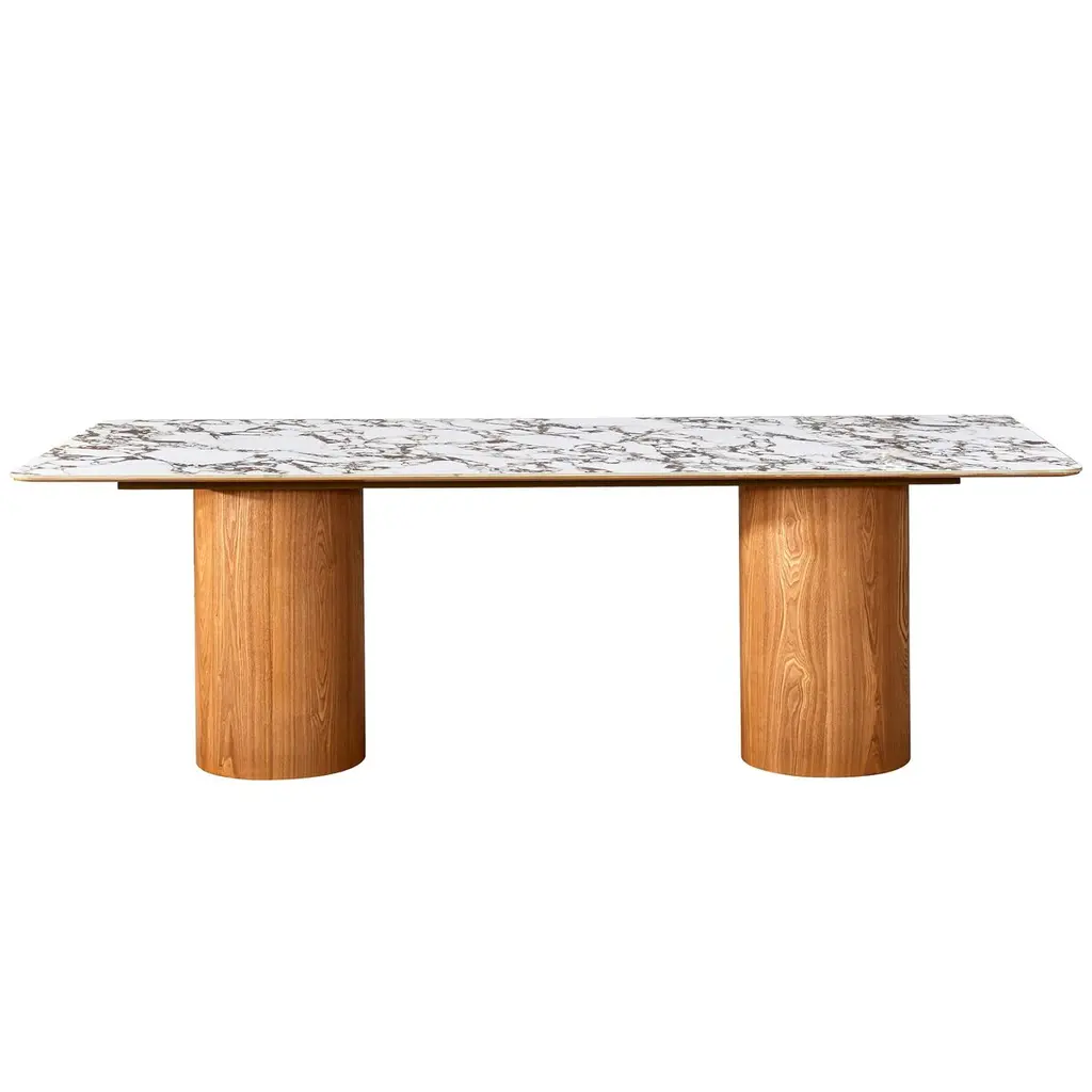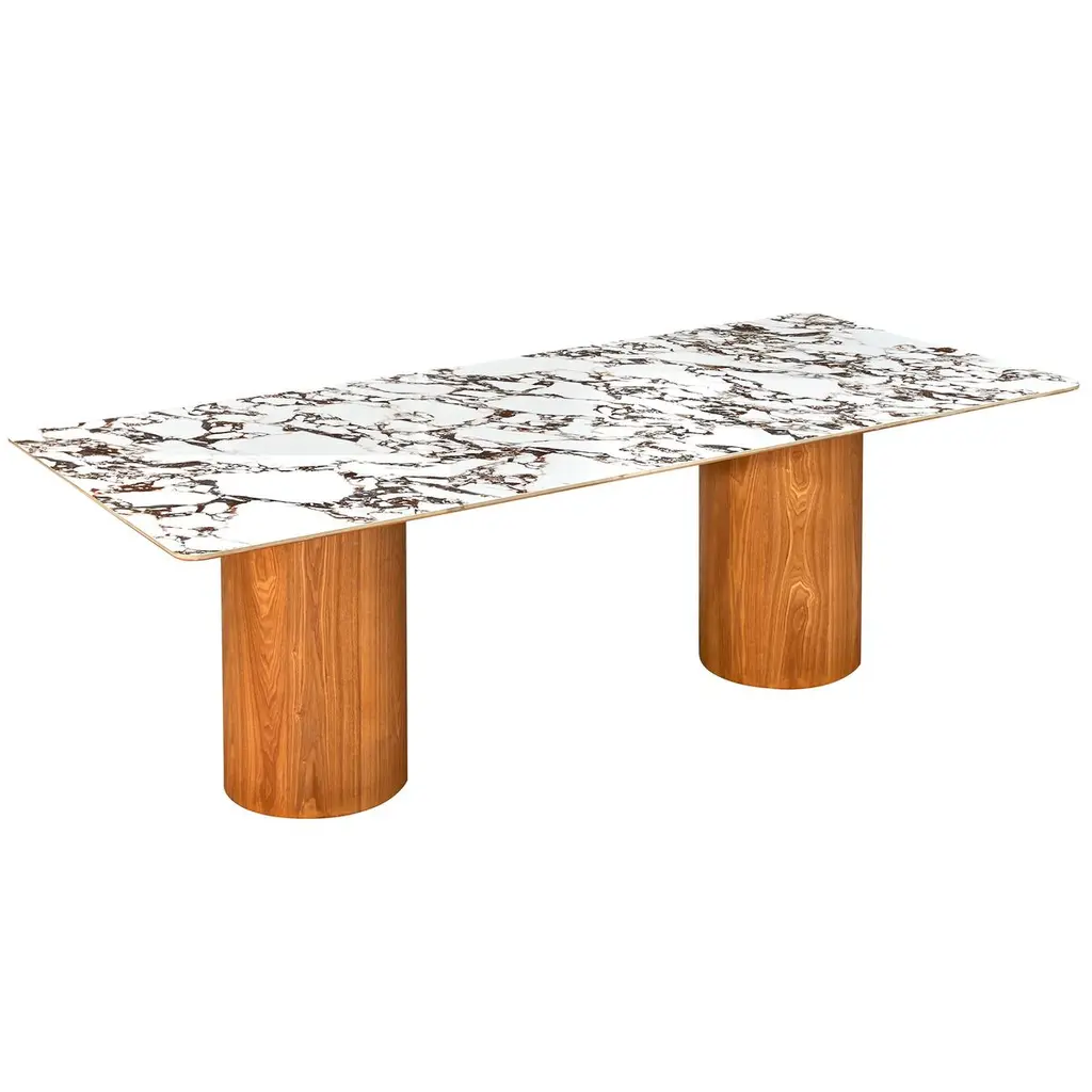 This handcrafted dining table's ceramic top has been given rich marbled veining that is enhanced by the tabletop's golden edging. The lavish grain of the wooden legs provides an earthy complement. Nearly eight feet wide, the table can seat eight people.
