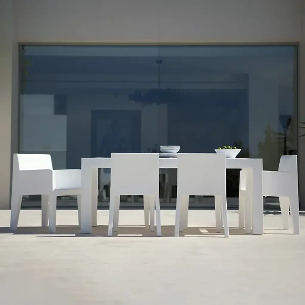 Showcasing artistic contrast, bold rectilinear shapes make up the minimalistic design of the long Jut Table 180. Clean, sharp lines and angles give the piece a contemporary charm, making dining more enjoyable indoors and out. The dining table's impact-resistant polyethylene material composition resistance to extreme atmospheric conditions and is durable enough for commercial use. While contributing to style, long perforations across the tabletop facilitate the spontaneous seepage of rainwater to keep the furniture dry. At 70-inches long, the table comfortably accommodates six persons. The Jut Table 180 is available in a range of vibrant colors and two finishes.