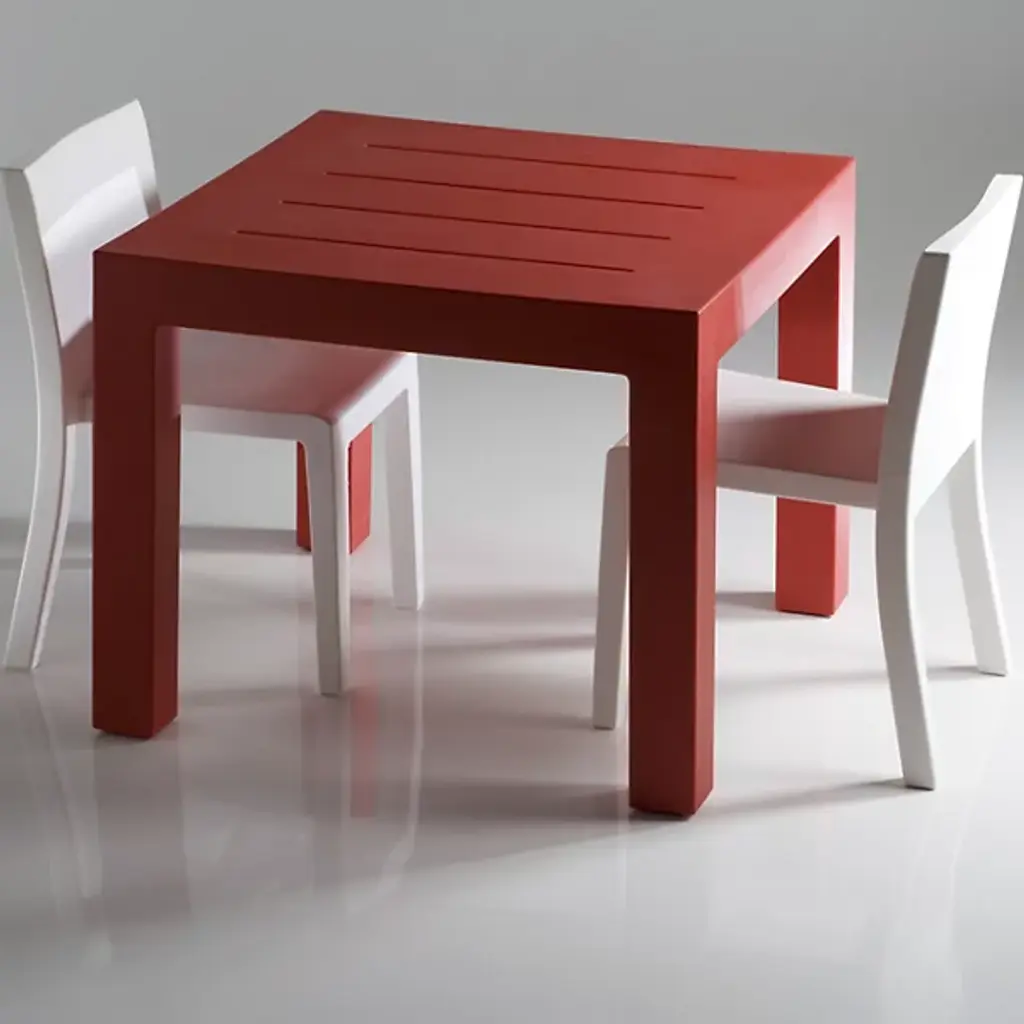 Showcasing artistic contrast, bold rectilinear shapes make up the minimalistic design of this small-sized Jut Table 90. Clean, sharp lines and angles give the piece a contemporary charm, making indoor and outdoor dining more enjoyable. The dining table's impact-resistant composition provides weather resistance capable of surviving extreme atmospheric conditions. While contributing to style, long perforations across the tabletop facilitate the spontaneous seepage of rainwater to keep the furniture dry. At 35.5-inches long and wide, the table can comfortably accommodates two persons. The Jut Table 90 is available in a range of bright colors and two finishes.